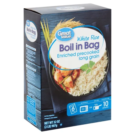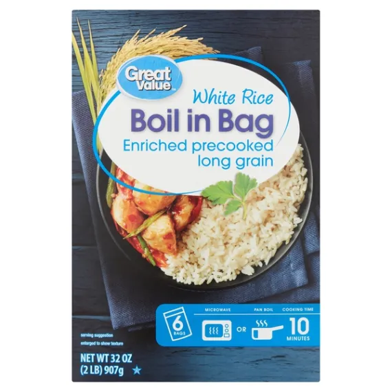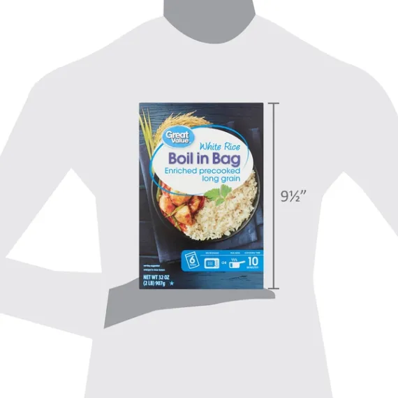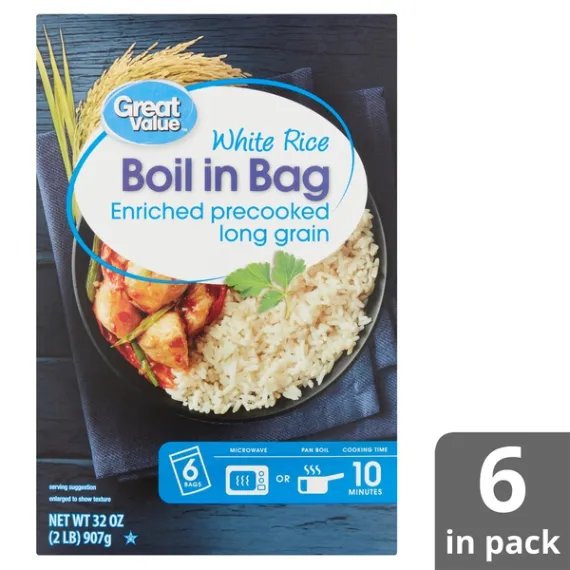 Details Ingredients PRECOOKED PARBOILED ENRICHED LONG GRAIN RICE (RICE, NIACIN, IRON [FERRIC ORTHOPHOSPHATE], THIAMINE [THIAMINE MONONITRATE], FOLIC ACID). Show more Product features Great Value Boil in Bag White Rice is great for your favorite dishes, made in a fraction of the time. Simply drop the bag in a pot of boiling water or microwave for 10 minutes. It's an excellent choice for quick meals either at work or at home with the family. Cook up a bag and add pan-seared chicken, grilled onions, peas, carrots, and an egg for a healthy chicken fried rice, serve with a side of steamed vegetables, or put on your chef's hat and whip up some southern gumbo or hearty jambalaya. Great Value Boil in Bag White Rice is only 210 calories per serving, gluten-free, and has no added sugars, sodium, fat, or cholesterol, making it ideal for health-conscious consumers. It comes with 6 bags of rice so you will have plenty for all of your homemade recipes. Grab some Great Value Boil in Bag White Rice and get creative in the kitchen today! Great Value products provide families with affordable, high quality grocery and household consumable options. With our wide range of product categories spanning grocery and household consumables, we offer you a variety of products for your family's needs. Our products are conveniently available online and in Walmart stores nationwide, allowing you to stock up and save money at the same time. 210 calories per serving No sodium Zero total fat and cholesterol No added sugars Gluten-free white rice Enriched precooked long grain Boil in bag 6 bags Microwave or pan boil for 10 minutes Net Quantity of Content ABOUT 15 X 0.5 cup
