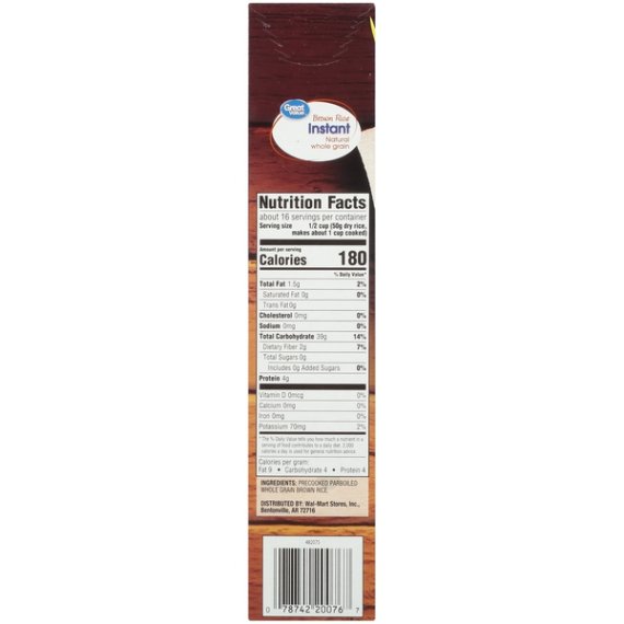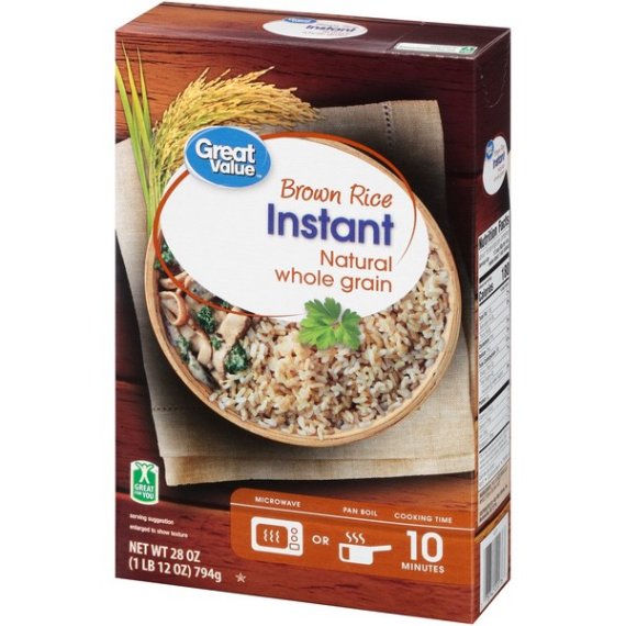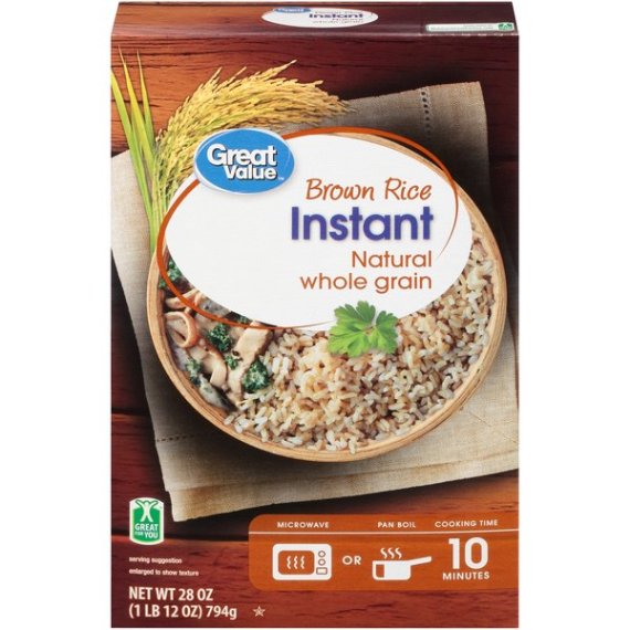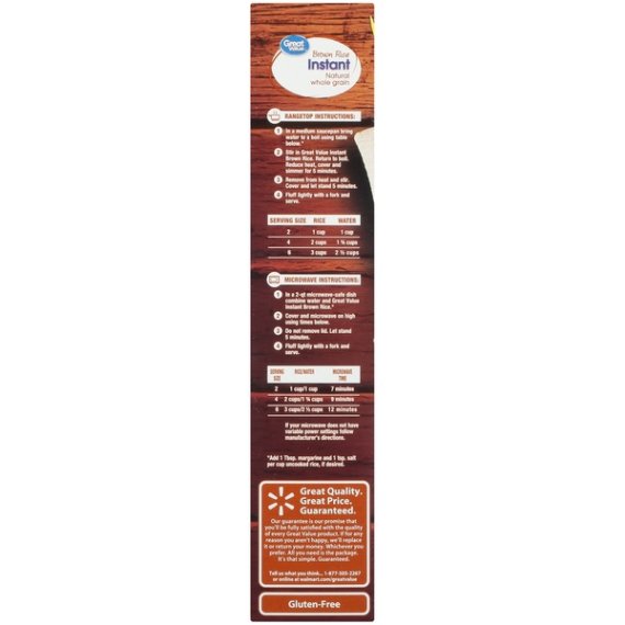 Details Ingredients Precooked parboiled whole grain brown rice Product features Great Value Brown Rice is a delicious natural whole grain rice that cooks in just 10 minutes. It's great for quick and easy meals at home or work. Use it as a side dish to your next Mexican inspired cuisine. Add an egg, your choice of veggies and fry it for a healthier fried rice. Serve with a side of roasted black beans. This rice is great for health conscious individuals as it is gluten-free and has no cholesterol, sodium or sugar. Spend less time in the kitchen and more time with your family with Great Value Instant Brown Rice. Great Value products provide families with affordable, high quality grocery and household consumable options. With our wide range of product categories spanning grocery and household consumables, we offer you a variety of products for your family’s needs. Our products are conveniently available online and in Walmart stores nationwide, allowing you to stock up and save money at the same time. Stovetop Instructions: In a medium saucepan bring water to a boil using table below. Remove from heat and stir. Cover and let stand 5 minutes. Microwave Instructions: In a 2-qt microwave-safe dish combine water and Great Value Instant Brown Rice. Cover and microwave on high using times below. Do not remove lid. Let stand 5 minutes. Fluff lightly with a fork and serve. Great Value Brown Rice, Instant,: Natural whole grain brown rice Cooks in 10 minutes Gluten-free Great for you Net Quantity of Content 16 X 1/2 Cup (50g dry rice, makes about 1 cup cooked )