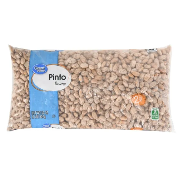 Details Ingredients Pinto Beans Product features Great Value Pinto Beans are a popular and nutritious choice for meals and sides with their delicious flavor and light texture. They can be eaten whole in broth, or mashed and refried. It is common as a filling for burritos, in chili con carne and can be served with rice, cornbread or corn tortillas as a staple meal. Use them in salads, soups and other delicious recipes or simply choose to enjoy them as a side dish. Pinto bean contains many essential nutrients and is very low in saturated fat. It is a good source of protein, and is very high in dietary fiber. This bag comes with 2 pounds of beans, making it easy to stock up and enjoy the wholesome taste for several servings. Great Value products provide families with affordable, high quality grocery and household consumable options. With our wide range of product categories spanning grocery and household consumables, we offer you a variety of products for your family's needs. Our products are conveniently available online and in Walmart stores nationwide, allowing you to stock up and save money at the same time. Great Value Pinto Beans: Contains 20 lb of pinto beans Can be used in salads, soups and other delicious recipes Low in saturated fat, and good source of protein and dietary fiber Kosher and gluten-free Special Features High in fiber Net Quantity of Content ABOUT 26 X 0.25 cup