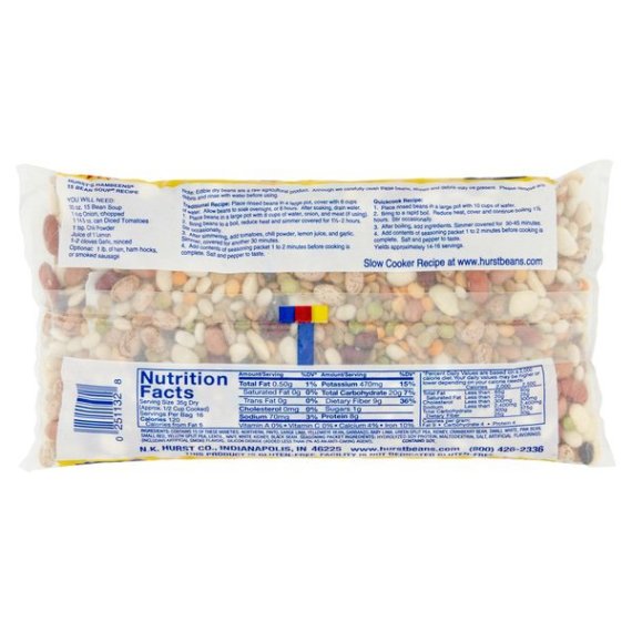 Details Ingredients Contains 15 of These Varieties: Northern, Pinto, Large Lima, Yelloweye Bean, Garbanzo, Baby Lima, Green Split Pea, Kidney, Cranberry Bean, Small White, Pink Bean, Small Red, Yellow Split Pea, Lentil, Navy, White Kidney, Black Bean. Seasoning Packet: Hydrolyzed Soy Protein, Maltodextrin, Salt, Artificial Flavorings (Including Artificial Smoke Flavor), Silicon Dioxide (Added Less than 2% as an Anti-Caking Agent). Show more Product features For updated, accurate country of origin data, it is recommended that you rely on product packaging or manufacturer information. Enjoy a rich, warm and hearty meal with Hurst's Hambeens, 15 Bean Soup Seasoning Packet. This protein-packed soup mix is naturally high in fiber and low in fat. The soup mix features kidney, black, lima, garbanzo, split pea, blackeye and pinto beans plus whole pearl barley. Original Hurst 15 bean soup comes with a seasoning packet.Hurst's Hambeens with Seasoning Packet Original 15 Bean Soup, 20 oz:Hurst's 15 bean soup recipeHurst's seasoning packet insideHigh fiber, low fatHambeens 15 bean soup, 20 ozIngredients: Ingredients: Contains 15 of These Varieties: Northern, Pinto, Large Lima, Blackeye, Garbanzo, Baby Lima, Green Split Pea, Kidney, Cranberry Bean, Small White, Pink Bean, Small Red, Yellow Split Pea, Lentil, Navy, White Kidney, Black Bean, Pearl Barley. Seasoning Packet: Hydrolyzed Soy Protein, Maltodextrin, Salt, Artificial Flavorings (Including Artificial Smoke Flavor), Partially Hydrogenated Cottonseed and Soybean Oil, Silicon Dioxide (Added Less Than 2% As An Anti-Caking Agent). Directions: Instructions: You Will Need: 1 Lb. Ham, Ham Hocks, Or Smoke Sausage, 1 Cup Onion Chopped, 1-15 Oz. Can Stewed Or Diced Tomatoes, 1 Tsp. Chili Powder, Juice of 1 Lemon, 1-2 Cloves Garlic, Minced. Hurst's Hambeens W/Seasoning pket Original 15 Bean Soup, 20 oz Net Quantity of Content 16 X 35.00 g