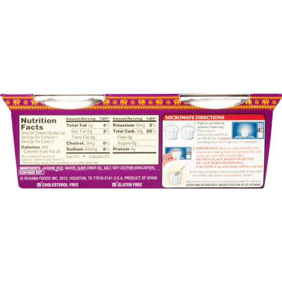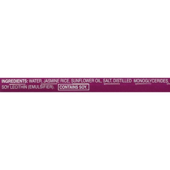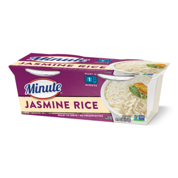 Details Ingredients WATER, JASMINE RICE, SUNFLOWER OIL, SEA SALT, MONOGLYCERIDES, SOY LECITHIN (EMULSIFIER). Product features The Minute Ready to Serve Jasmine Rice allows you to have authentic Thai Jasmine Rice which will enhance any Asian-style recipe with its natural delicate butter flavor and aromatic scent. It is perfect for eating as a simple side dish or foundation for your favorite meal. This comes in an 8.8-ounce pack. Minute Rice is part of Riviana Foods, Inc. and, since 1949, has consistently brought the goodness of quality rice products right to the American farmer and right to your dinner table. Delight your taste buds, enjoy your meal, and love every Minute! Healthy rice portions in one convenient pack Contains zero trans fat or cholesterol MSG-free with no gluten or preservatives Easy-to-prepare, deliciously flavored rice for whatever occasion Comes in an 8.8-ounce pack Net Quantity of Content 2 X 1 cup