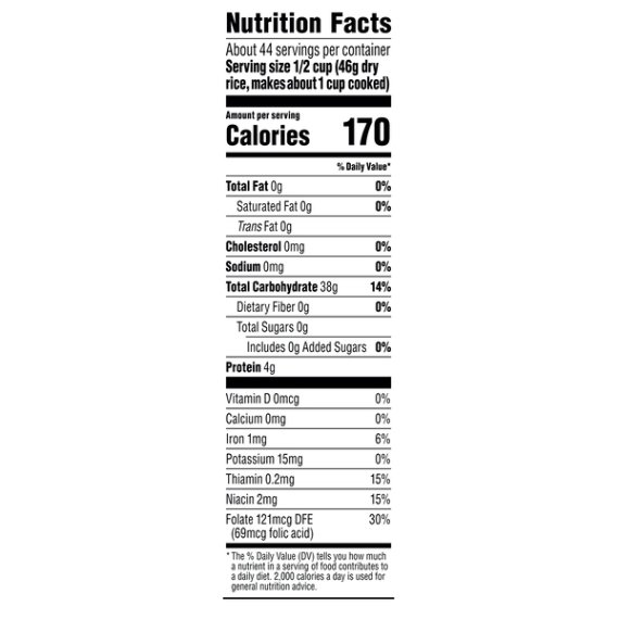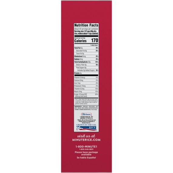 Details Ingredients ENRICHED PRECOOKED LONG GRAIN RICE [RICE, NIACIN, IRON (FERRIC ORTHOPHOSPHATE), THIAMIN (THIAMIN MONONITRATE), FOLIC ACID]. Show more Product features Minute Instant White Rice is a delicious addition to any meal. It is made with no preservatives or MSG and is both gluten-free and non-GMO, so you can rest assured that our products are made with your health in mind. In just 5 minutes, you'll have delectable rice that is sure to enhance any meal. This long grain rice is enriched, precooked, and then dried with nothing added but pure convenience. Feel free to get creative with dinner by adding veggies, proteins or sauces to your rice or cook the rice in broths/fruit juices in place of water. Each order includes one 72-ounce box of instant rice at the ready! Minute Rice is part of Riviana Foods, Inc. and, since 1949, has consistently brought the goodness of quality rice products right to the American farmer and right to your dinner table. Delight your taste buds, enjoy your meal, and love every Minute! Easy-to-make long grain rice for a variety of healthy dishes Cooks up in just 1 minute! Non-GMO Project Verified and Kosher Completely gluten-free Made with zero preservatives Great for those with an eye on their cholesterol as well as on the time! Includes one 72-ounce box of instant enriched rice Net Quantity of Content ABOUT 44 X 0.5 cup