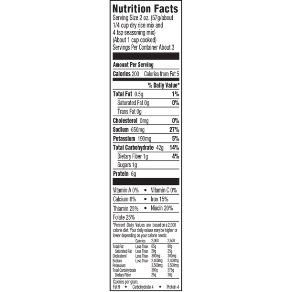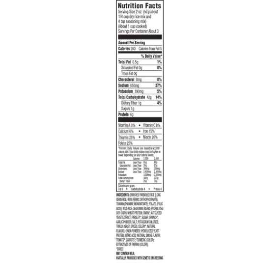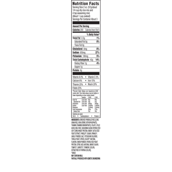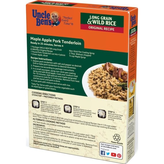 Details Ingredients Enriched Parboiled Rice [Long Grain Rice, Iron (Ferric Orthophosphate), Thiamin (Thiamine Mononitrate), Folate (Folic Acid)]; Wild Rice; Seasoning Blend [Hydrolyzed Soy/Corn/Wheat Protein; Onion*; Autolyzed Yeast Extract; Parsley*; Sugar; Spinach*; Garlic Powder; Salt; Potassium Chloride; Torula Yeast; Spices; Celery*; Natural Flavors; Onion Powder; Hydrolyzed Yeast Protein; Citric Acid; Natural Smoke Flavor; Tomato*; Carrots*; Tumeric (Color); Extractive of Paprika (Color)]. *Dried Show more Product features A unique blend of wild rice, long grain rice, and 23 natural herbs and seasonings, this is sure to dress up your rice dishes and family meals. Cooks in 25 minutes No trans fat, no saturated fat Cholesterol free Excellent source of folic acid UNCLE BEN’S® uses premium rice grains grown in the U.S.A. Special Features 100% natural flavor Net Quantity of Content ABOUT 3 X 2 oz
