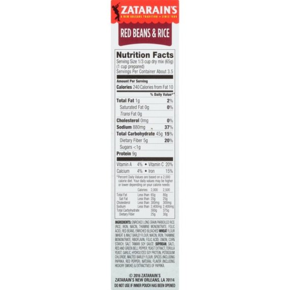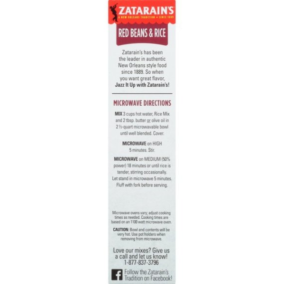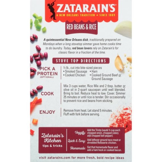 Details Ingredients Enriched Long Grain Parboiled Rice (Rice, Iron, Niacin, Thiamine Mononitrate, Folic Acid), Red Beans, Enriched Bleached Wheat Flour (Wheat & Malt Barley Flour, Niacin, Iron, Thiamine Mononitrate, Riboflavin, Folic Acid), Onion, Corn Starch, Salt, Tamari Soy Sauce (Soybean, Salt), Red and Green Bell Pepper, Yeast Extract, Torula Yeast, Garlic, Hydrolyzed Soy Protein, Potassium Chloride, Malted Barley Flour, Spices (Including Paprika, Red Pepper), Natural Flavor (Including Hickory Smoke), & Extractives of Paprika. Show more Product features A quintessential New Orleans dish, traditionally prepared on Mondays when a long stovetop simmer gave home cooks time to do laundry. Today, red bean lovers rely on Zatarain’s for classic flavor in a fraction of the time. Enjoy Zatarain’s Red Beans & Rice as a main course or side dish. Supplement with sausage, ham or pork chops, or hold the meat and have a tasty vegetarian meal. However you prepare it, Zatarain’s Red Beans & Rice is hearty but not heavy, packed full of flavor and an instant crowd-pleaser. Features long grain white rice and tender red beans Contains blend of seasonings, including hickory smoke flavor Prepared and on the table in less than 30 minutes Serve as a side dish or complete meal with the addition of meat Can be made on the stove top or in the microwave Net Quantity of Content 3.5 X 65