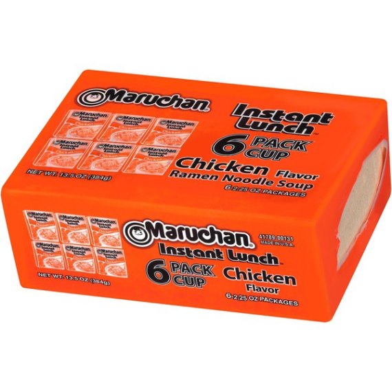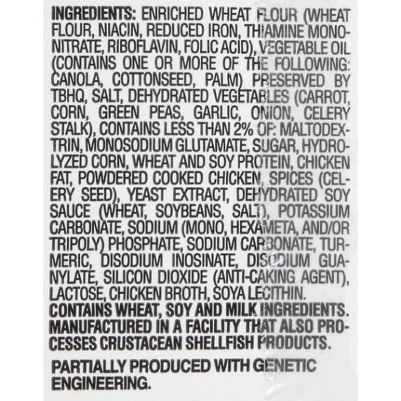 Details Ingredients ENRICHED WHEAT FLOUR (WHEAT FLOUR, NIACIN, REDUCED IRON, THIAMINE MONONITRATE, RIBOFLAVIN, FOLIC ACID), VEGETABLE OIL (CONTAINS ONE OR MORE OF THE FOLLOWING: CANOLA, COTTONSEED, PALM) PRESERVED BY TBHQ, SALT, DEHYDRATED VEGETABLES (CARROT, CORN, GREEN PEAS, GARLIC, ONION, CELERY STALK), CONTAINS LESS THAN 2% OF: MALTODEXTRIN, MONOSODIUM GLUTAMATE, SUGAR, HYDROLYZED CORN, WHEAT AND SOY PROTEIN, CHICKEN FAT, POWDERED COOKED CHICKEN, SPICES (CELERY SEED), YEAST EX-TRACT, DEHYDRATED SOY SAUCE (WHEAT, SOYBEANS, SALT), POTASSIUM CARBONATE, SODIUM (MONO, HEXAMETA, AND/OR TRIPOLY) PHOSPHATE, SODIUM CARBONATE, TURMERIC, DISODIUM INOSINATE, DISODIUM GUANYLATE, SILICON DIOXIDE (ANTI-CAKING AGENT), LACTOSE, CHICKEN BROTH, SOYA LECITHIN. Show more Product features Maruchan Instant Lunch is fast and tasty as a hot snack or delicious meal anytime. Ramen Noodles, with Vegetables, Chicken Flavor, 6 Pack www.maruchan.com. Product of USA. Special Features With vegetables Net Quantity of Content 6.0 X 1 cup