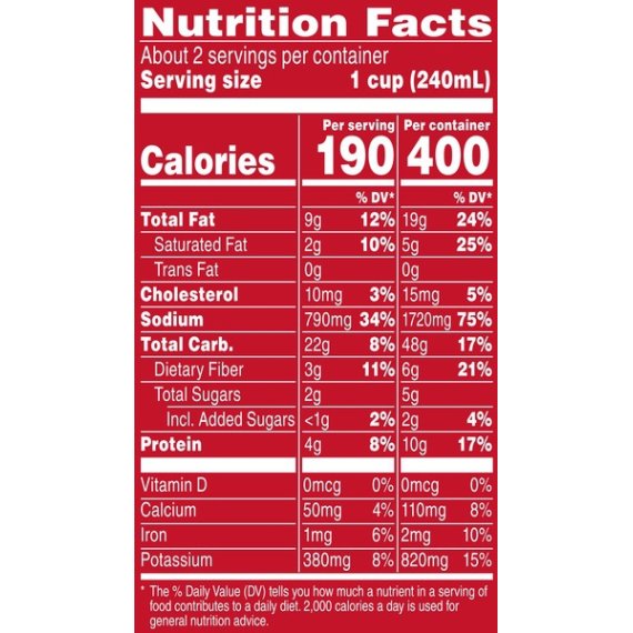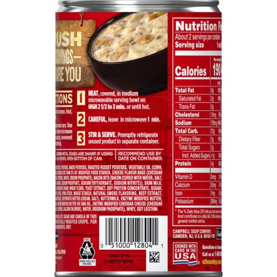 Details Ingredients Ingredients: Water, Chicken Stock, Potatoes, Baked Potatoes, Roasted Russet Potatoes, Vegetable Oil (Corn, Canola, And/Or Soybean), Contains Less Than 2% Of: Modified Food Starch, Cheese Flavor Base (Cheddar Cheese [Milk, Cultures, Salt, Enzymes], Water, Sodium Phosphate), Bacon Bits (Bacon [Cured With Water, Salt, Sugar, Natural Smoke Flavoring, Sodium Phosphate, Sodium Erythorbate, Sodium Nitrite]), Skim Milk, Dehydrated Onions, Salt, Dehydrated Cream, Wheat Flour, Yeast Extract, Soy Protein Concentrate, Sugar, Flavoring, Pork, Pork Fat, Spices, Pork Stock, Wheat Starch, Natural Smoke Flavoring, Beef Extract, Sunflower Lecithin, Onion Extract, Dehydrated Butter (Cream, Salt), Buttermilk, Enzyme Modified Butter, Whey Protein Concentrate, Enzyme Modified Butter Fat And Oil, Enzyme Modified Cheddar Cheese (Cheddar Cheese [Milk, Cultures, Salt, Enzymes, Calcium Chloride], Water, Disodium Phosphate), Whey, Soy Lecithin. Show more Product features Campbell's Chunky Baked Potato with Cheddar & Bacon Bits Soup takes all the best flavors of a baked potato and creates them into something satisfying and spoonable. Big chunks of fresh and baked potatoes, cheddar cheese and flavorful bacon create a fill-you-up soup that's made to tackle even the heartiest appetite. Like every Chunky variety, it fills you up with every bite. Enjoy the flavor of baked potatoes, cheddar cheese and bacon in a soup Packaged in a non-BPA-lined 18.8 oz. can 10 grams of protein per can No MSG Added, No artificial colors A great choice when you’re hungry and don’t have time to cook Special Features Crisp bacon bits Net Quantity of Content 2.0 X 1 cup (240mL)