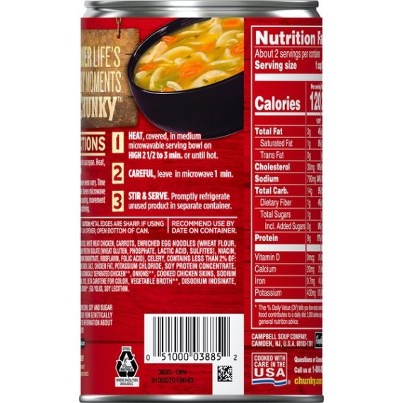 Details Ingredients Ingredients: Chicken Stock, White Meat Chicken, Carrots, Enriched Egg Noodles (Wheat Flour, Eggs, Egg Whites, Wheat Protein Isolate [Wheat Gluten, Phosphate, Lactic Acid, Sulfites], Niacin, Ferrous Sulfate, Thiamine Mononitrate, Riboflavin, Folic Acid), Celery, Contains Less Than 2% Of: Water, Modified Food Starch, Salt, Chicken Fat, Potassium Chloride, Soy Protein Concentrate, Yeast Extract, Sugar, Mechanically Separated Chicken**, Onions**, Cooked Chicken Skins, Sodium Phosphate, Flavoring, Spice, Beta Carotene For Color, Vegetable Broth**, Disodium Inosinate, Disodium Guanylate, Chicken**, Egg Yolks, Soy Lecithin. **Dehydrated Show more Product features Campbell's Chunky Classic Chicken Noodle Soup isn’t just tasty-it's made to work as hard as you do. With never-ending big flavors and bold ingredients, our comfort food classic is capable of fueling even the heartiest appetite. Crafted with big pieces of chicken meat with no antibiotics, chunks of quality vegetables and enriched egg noodles, we load every can with the fill-you-up flavors that you'll never stop loving. Classic chicken noodle soup made with big pieces of chicken meat with no antibiotics, chunks of quality vegetables and enriched egg noodles Packaged in a 18.6 oz. non-BPA-lined, recyclable can No MSG Added Perfect to grab when you're hungry and crunched for time Count on this classic to satisfy the heartiest of appetites Special Features Good source of protien Net Quantity of Content 2.0 X 1 CUP (240mL)