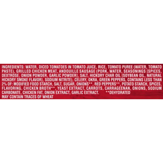 Details Ingredients Ingredients: Water, Diced Tomatoes In Tomato Juice, Rice, Tomato Puree (Water, Tomato Paste), Grilled Chicken Meat, Andouille Sausage (Pork, Water, Seasonings [Spices, Dextrose, Onion Powder, Garlic Powder], Salt, Hickory Char Oil [Soybean Oil, Natural Hickory Smoke Flavor], Sodium Nitrite), Celery, Okra, Green Peppers, Contains Less Than 2% Of: Modified Food Starch, Salt, Sugar, Onions**, Red Peppers**, Potato Starch, Spices, Flavoring, Chicken Broth**, Yeast Extract, Carrots, Carrageenan, Onions, Sodium Carbonate, Chicken Fat, Onion Extract, Garlic Extract. **Dehydrated May Contain Traces Of Wheat Show more Product features Get a hearty taste of the Big Easy with Campbell’s Chunky Grilled Chicken & Sausage Gumbo Soup. Each and every spoonful is bursting with flavor thanks to hearty pieces of grilled chicken meat, Andouille sausage, okra, peppers and tasty spices. Enjoy the soup that eats like a meal on its own or try it poured over rice. Enjoy the authentic Creole flavors of stewed with grilled chicken meat, rice, Andouille sausage, okra and peppers Packaged in a 18.8 oz., non-BPA-lined can 15 grams of protein per can No MSG added, No artificial colors A great choice when you’re hungry and crunched for time Special Features Good source Of protien Net Quantity of Content 2.0 X 1 cup (240mL)