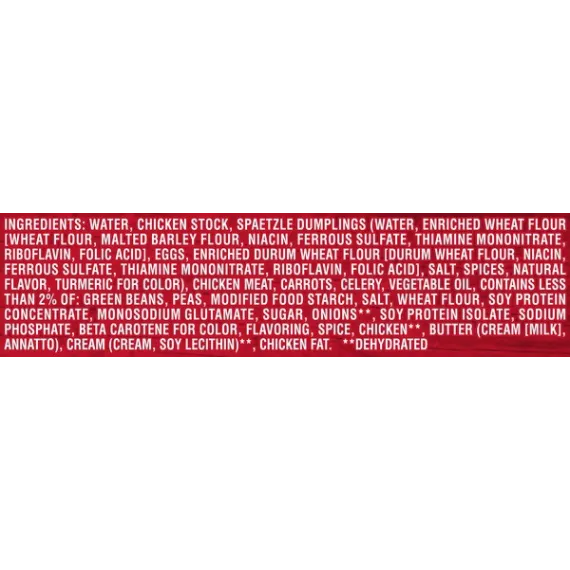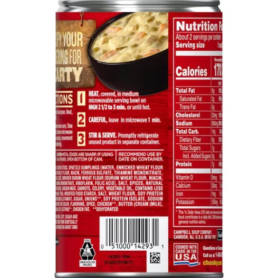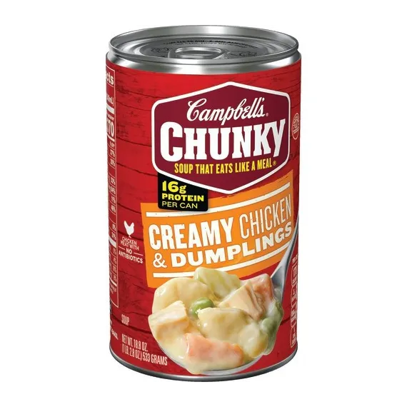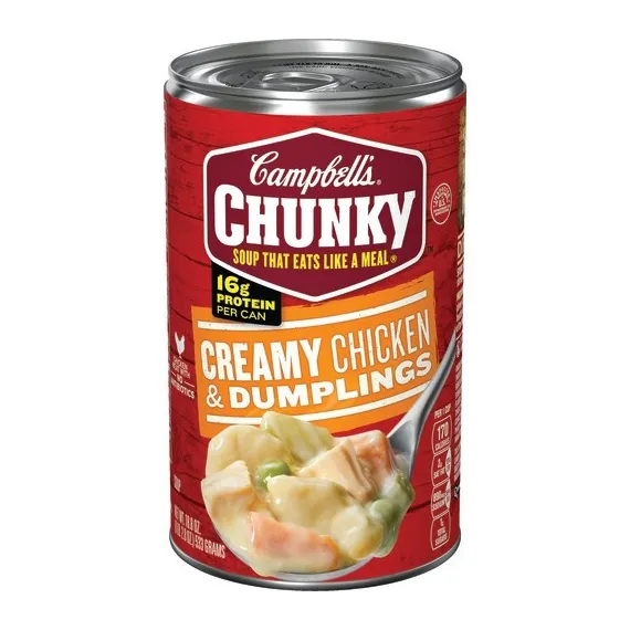Details Ingredients Ingredients: Water, Chicken Stock, Spaetzle Dumplings (Water, Enriched Wheat Flour [Wheat Flour, Malted Barley Flour, Niacin, Ferrous Sulfate, Thiamine Mononitrate, Riboflavin, Folic Acid], Eggs, Enriched Durum Wheat Flour [Durum Wheat Flour, Niacin, Ferrous Sulfate, Thiamine Mononitrate, Riboflavin, Folic Acid], Salt, Spices, Natural Flavor, Turmeric For Color), Chicken Meat, Carrots, Celery, Vegetable Oil, Contains Less Than 2% Of: Green Beans, Peas, Modified Food Starch, Salt, Wheat Flour, Soy Protein Concentrate, Monosodium Glutamate, Sugar, Onions**, Soy Protein Isolate, Sodium Phosphate, Beta Carotene For Color, Flavoring, Spice, Chicken**, Butter (Cream [Milk], Annatto), Cream (Cream, Soy Lecithin)**, Chicken Fat. **Dehydrated Show more Product features Campbell's Chunky Creamy Chicken & Dumpling Soup takes the comforting southern classic to new levels through big fill-you-up flavors and high-quality, hearty ingredients. Loaded with big pieces of chicken meat with no antibiotics, comforting spaetzle dumplings and savory veggies, you’ll conquer your hunger and keep coming back for more. Loaded with hearty pieces of chicken meat with no antibiotics, spaetzle dumplings and savory veggies Each non-BPA-lined, 18.8 oz. can has 2 servings 16 grams of protein per can Ready in minutes-a great choice when you’re hungry and don’t have time to cook Expect bold flavor and big pieces in every spoonful Special Features Good source Of protien Net Quantity of Content 2.0 X 1 CUP ( 240 mL)