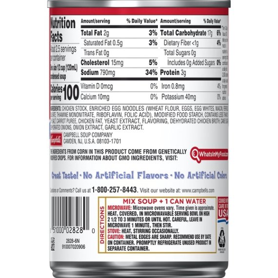 Details Ingredients Ingredients: Chicken Stock, Enriched Egg Noodles (Wheat Flour, Eggs, Egg Whites, Niacin, Ferrous Sulfate, Thiamine Mononitrate, Riboflavin, Folic Acid), Modified Food Starch, Contains Less Than 2% Of: Salt, Carrot Puree, Chicken Fat, Yeast Extract, Flavoring, Dehydrated Chicken Broth, Cane Sugar, Dehydrated Onions, Onion Extract, Garlic Extract. Show more Product features Kids will love that Campbell’s Condensed Double Noodle Soup is packed with twice as many enriched egg noodles. Our double-the-noodle soup is built with a comforting chicken broth infused with herbs and tender chicken meat with no antibiotics. It lacks artificial flavors or colors, and is your secret weapon for making your kids happy at mealtimes. Kids love that our soup features twice as many noodles in a comforting herb-infused chicken broth Packaged in a non-BPA-lined, 11 oz. recyclable can Made with chicken meat with no antibiotics No artificial flavors or colors The secret weapon for making your kids happy at mealtime Special Features Kids favorites Net Quantity of Content 2.5 X 1/2 cup (120mL) condensed soup