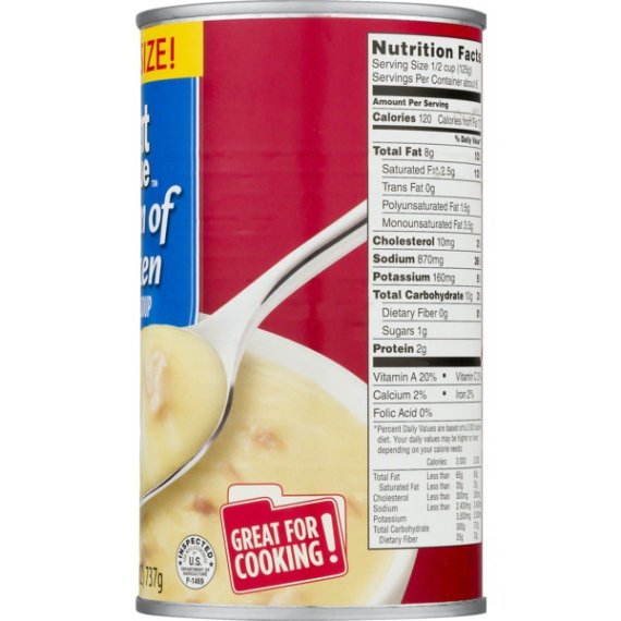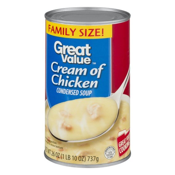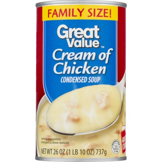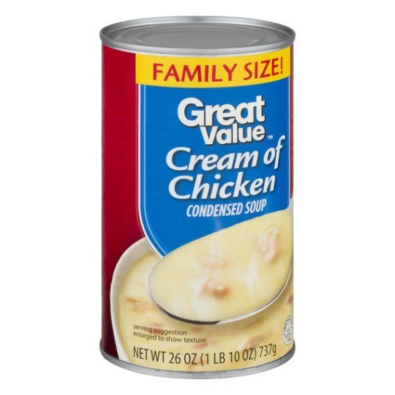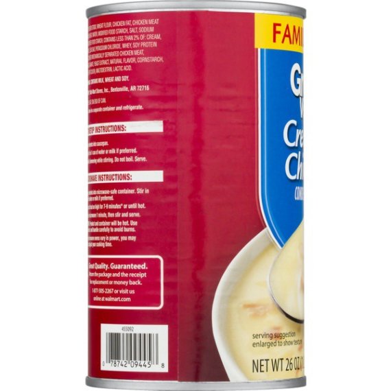 Details Ingredients Chicken Stock, Wheat Flour, Chicken Fat, Chicken Meat (Cooked Chicken Meat, Water, Modified Food Starch, Salt, Sodium Phosphate), Modified Food Starch, Contains less than 2% of: Cream, Salt, Soybean Oil, Sea Salt, Potassium Chloride, Whey, Soy Protein Concentrate, Cooked Mechanically Separated Chicken Meat, Monosodium Glutamate, Yeast Extract, Natural Flavor, Cornstarch, Beta Carotene (for Color), Maltodextrin, Lactic Acid Show more Product features Great Value Cream of Chicken Condensed Soup is an easy way to enjoy a warm bowl of soup with your family for a quick and delicious meal even on your busiest nights. Great Value Cream of Chicken Condensed Soup is also fantastic used as a base for family favorite comfort food casseroles such as chicken and rice or a warm, flaky pot pie. This famliy size can contains about 6 servings, perfect for warming hungry bellies in a hurry. With only 120 calories and 0 grams of trans fat per serving, you know you’re feeding your family the best. Bring home Great Value Cream of Chicken Condensed Soup tonight for a delicious, nutritious meal. Great Value products provide families with affordable, high quality grocery and household consumable options. With our wide range of product categories spanning grocery and household consumables, we offer you a variety of products for your family's needs. Our products are conveniently available online and in Walmart stores nationwide, allowing you to stock up and save money at the same time. Great Value Cream Of Chicken Condensed Soup, Family Size, 26 oz: Quick and delicious meal Use as a base ingredient in casseroles and comfort foods No trans fat or cholesterol About 6 servings per can Net Quantity of Content 6 X 123 G