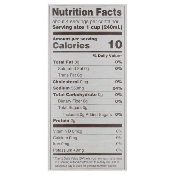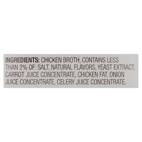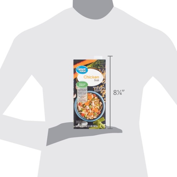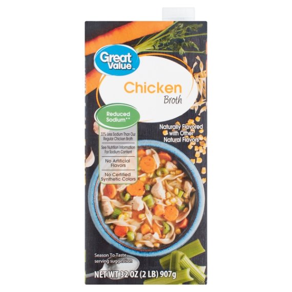 Details Ingredients CHICKEN STOCK, CONTAINS 1% OR LESS OF SALT, DEXTROSE, YEAST EXTRACT, NATURAL FLAVOR, CELERY JUICE CONCENTRATE, CARROT JUICE CONCENTRATE, ONION JUICE CONCENTRATE. Show more Product features Reduced sodium** **This product contains 550mg sodium per serving compared to 840mg sodium per serving in our regular Great Value Chicken Broth. Your recipes will be bursting with flavor when you add in a bit of Great Value Chicken Broth. This 32-ounce package is a kitchen staple you'll want to keep on hand for a variety of dishes from savory stew to flavorful pasta. You'll love the convenience of having ready-to-heat stock within reach to give you a jump on those work night dinners. You can use it as a base for a delicious and hearty soup, add it to rice one ladle at a time for a luxurious risotto, or take any veggie dish up a notch by simmering ingredients in this flavorful broth. Keep your chicken moist and tender or create a mouth-watering sauce to go with any meal. The possibilities never end when you have Great Value Chicken Broth in your pantry. Great Value products provide families with affordable, high quality grocery and household consumable options. With our wide range of product categories spanning grocery and household consumables, we offer you a variety of products for your family's needs. Our products are conveniently available online and in Walmart stores nationwide, allowing you to stock up and save money at the same time. 32oz (2lb) TetraPak 33% less sodium than our regular chicken broth No artificial flavors No certified synthetic colors Includes celery, onion, and carrot juices for outstanding flavor 0g of added sugars Net Quantity of Content ABOUT 4 X 1 cup