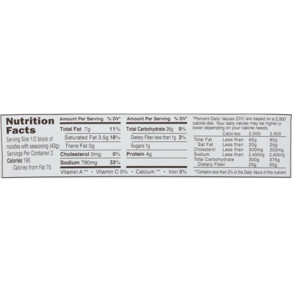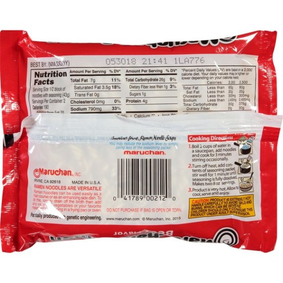 Details Ingredients RAMEN NOODLE INGREDIENTS: ENRICHED WHEAT FLOUR (WHEAT FLOUR, NIACIN, REDUCED IRON, THIAMINE MONONITRATE, RIBOFLAVIN, FOLIC ACID),VEGETABLE OIL (CONTAINS ONE OR MORE OF THE FOLLOWING: CANOLA, COTTONSEED, PALM) PRESERVED BY TBHQ, CONTAINS LESS THAN 1% OF: SALT, SOY SAUCE (WATER, WHEAT, SOYBEAN, SALT), POTASSIUM CARBONATE, SODIUM (MONO, HEXAMETA, AND/OR TRIPOLY) PHOSPHATE, SODIUM CARBONATE, TURMERIC. SOUP BASE INGREDIENTS: SALT, SUGAR, CONTAINS LESS THAN 1% OF: MALTODEXTRIN, MONOSODIUM GLUTAMATE LACTOSE, DEHYDRATED SOY SAUCE (WHEAT, SOYBEANS, SALT), CARAMEL COLOR, SPICES, BEEF FAT, YEAST EXTRACT, HYDROLYZED CORN, WHEAT AND SOY PROTEIN, DEHYDRATED VEGETABLES (ONION, GARLIC, CHIVE), NATURAL FLAVOR, DISODIUM INOSINATE, DISODIUM GUANYLATE. Show more Product features Beef Flavor Ramen Noodle Soup Product Features Cooks in 3 minutes Americas finest ramen noodle soups Maruchan®, Inc., Irvine, CA, 92618. www.maruchan.com © Maruchan, Inc. 2015 Special Features Grams trans fat Net Quantity of Content 2 X 43 g