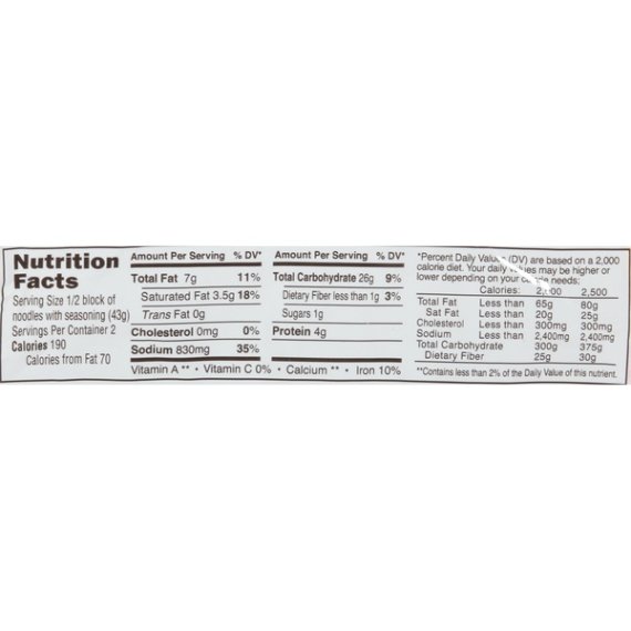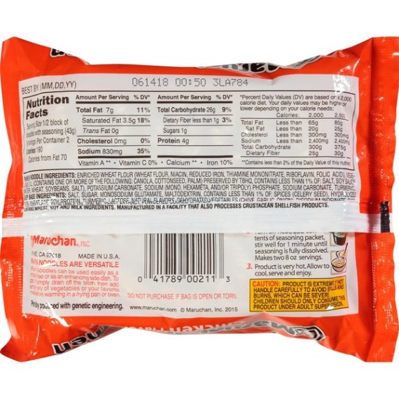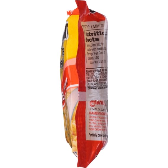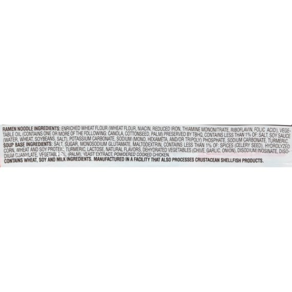 Details Ingredients RAMEN NOODLE INGREDIENTS: ENRICHED WHEAT FLOUR (WHEAT FLOUR, NIACIN, REDUCED IRON, THIAMINE MONONITRATE, RIBOFLAVIN, FOLIC ACID), VEGETABLE OIL (CONTAINS ONE OR MORE OF THE FOLLOWING: CANOLA, COTTONSEED, PALM) PRESERVED BY TBHQ, CONTAINS LESS THAN 1% OF: SALT, SOY SAUCE (WATER, WHEAT, SOYBEANS, SALT), POTASSIUM CARBONATE, SODIUM (MONO, HEXAMETA, AND/OR TRIPOLY) PHOSPHATE, SODIUM CARBONATE, TURMERIC., SOUP BASE INGREDIENTS: SALT, SUGAR, MONOSODIUM GLUTAMATE, CONTAINS LESS THAN 1% OF: MALTODEXTRIN, LACTOSE, SPICES (CELERY SEED), HYDROLYZED CORN, WHEAT AND SOY PROTEIN, TURMERIC, NATURAL FLAVORS, DEHYDRATED VEGETABLES (GARLIC, ONION, CHIVE), DISODIUM INOSINATE, DISODIUM GUANYLATE, VEGETABLE OIL (PALM), YEAST EXTRACT, POWDERED COOKED CHICKEN, CABBAGE EXTRACT. Show more Product features Maruchan Ramen Noodle Chicken Flavor Soup, 3 oz Soup, Ramen Noodle, Chicken Flavor 0 grams trans fat. See nutrition information for sodium content. Cooks in 3 minutes. Ramen Noodles are Versatile: Ramen Noodles can be used easily as a main course or as an enhancing side dish. To do this, simply drain off the broth then add any variety of vegetables or your favorite meat before warming in a frying pan or oven. You may reduce the sodium level by simply using less of the seasoning packet. America's finest Ramen Noodle Soups. Quality Guaranteed. www.maruchan.com. Special Features 0 grams trans fat Net Quantity of Content 2 X 43 g
