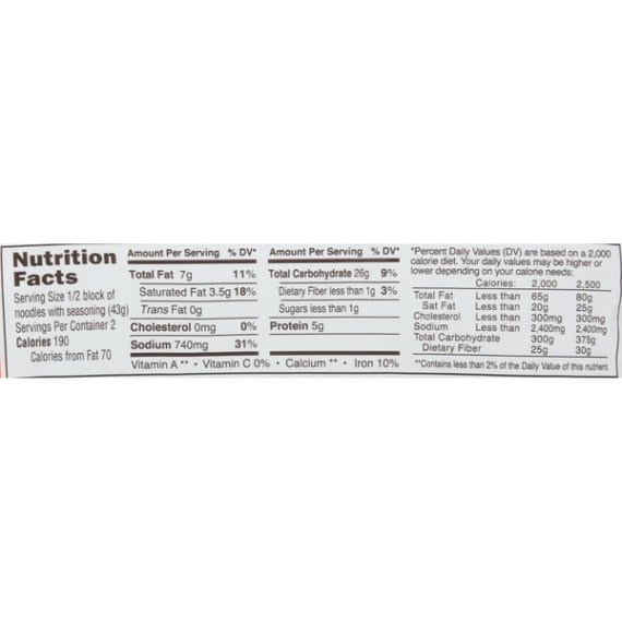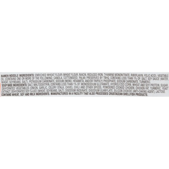 Details Ingredients RAMEN NOODLE INGREDIENTS: ENRICHED WHEAT FLOUR (WHEAT FLOUR, NIACIN, REDUCED IRON, THIAMINE MONONITRATE, RIBOFLAVIN, FOLIC ACID), VEGETABLE OIL (CONTAINS ONE OR MORE OF THE FOLLOWING: CANOLA, COTTONSEED, PALM) PRESERVED BY TBHQ, CONTAINS LESS THAN 1% OF: SALT, SOY SAUCE (WATER, WHEAT, SOYBEANS, SALT), POTASSIUM CARBONATE, SODIUM (MONO, HEXAMETA, AND/OR TRIPOLY) PHOSPHATE, SODIUM CARBONATE, TURMERIC. SOUP BASE INGREDIENTS: SALT, MALTODEXTRIN, CONTAINS LESS THAN 1% OF: MONOSODIUM GLUTAMATE, HYDROLYZED CORN, WHEAT AND SOY PROTEIN, SUGAR, DEHYDRATED VEGETABLES (ONION, GARLIC, CELERY STALK, CHIVE), CHILI AND OTHER SPICES, POWDERED COOKED CHICKEN, CHICKEN FAT, TURMERIC, YEAST EXTRACT, DEHYDRATED SOY SAUCE (WHEAT, SOYBEANS, SALT), DISODIUM INOSINATE, DISODIUM GUANYLATE, SILICON DIOXIDE (ANTI-CAKING AGENT), LACTOSE. Show more Product features Enjoy a delicious bowl of Maruchan Ramen Picante Chicken Ramen Noodle Soup. It is the classic affordable hot meal. This versatile dish is a meal in itself, and can also be used as a side dish. Add meats and vegetables to the Maruchan ramen noodle soup for variety. It contains no trans fats and takes just three minutes to prepare, making it a good meal when in a rush. The Maruchan chicken ramen soup (3 oz) brings a kick of flavor to the palate and a quick way to satisfy hunger. Enjoy some for lunch or dinner. Say goodbye to land pasta with this versatile dish. Maruchan Ramen Picante Chicken Noodle Soup: 0g trans fat Maruchan ramen noodle soup cooks in 3 minutes Special Features Hot And spicy Net Quantity of Content 2 X 43 g