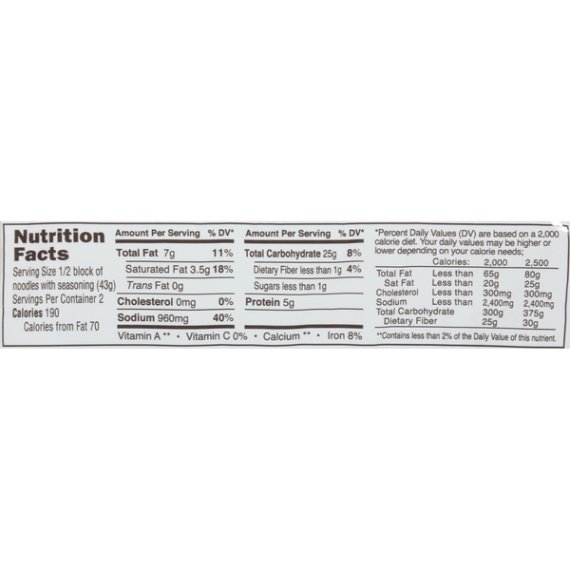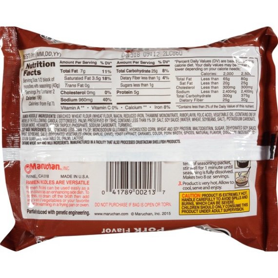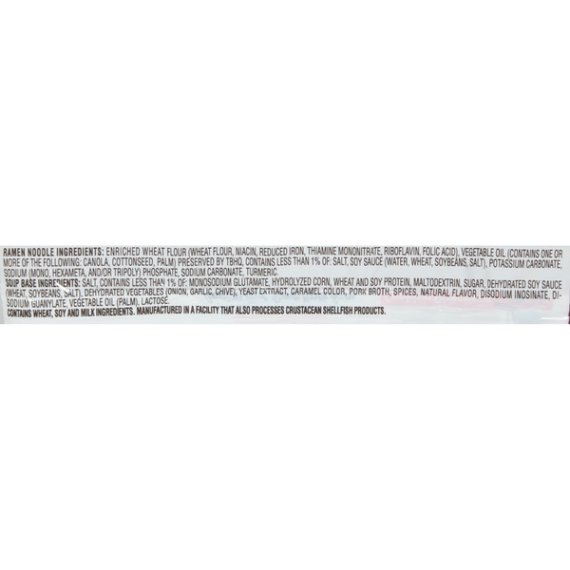 Details Ingredients Ramen Noodle: Enriched Wheat Flour (Wheat Flour, Niacin, Reduced Iron, Thiamine Mononitrate, Riboflavin, Folic Acid), Vegetable Oil (Contains One or More of the Following: Canola, Cottonseed, Palm) Preserved by TBHQ, Contains Less than 1% of: Salt, Soy Sauce (Water, Wheat, Soybeans, Salt), Potassium Carbonate, Sodium (Mono, Hexameta, and/or Tripoly) Phosphate, Sodium Carbonate, Turmeric. Soup Base: Salt, Hydrolyzed Corn, Wheat and Soy Protein, Contains Less than 1% of: Monosodium Glutamate, Maltodextrin, Sugar, Dehydrated Vegetables (Onion, Garlic, Chive), Yeast Extract, Pork Flavor Powder (Dehydrated Pork Broth, Milk), Caramel Color, Spice, Dehydrated Soy Sauce (Wheat, Soybeans, Salt), Natural Flavor, Vegetable Oil (Palm), Disodium Inosinate, Disodium Guanylate. Show more Product features Ramen Noodle Soup, Pork Flavor 3 oz (85 g) 0 grams trans fat. Cooks in 3 minutes. Ramen Noodles are versatile. Ramen Noodles can be used easily as a main course or as an enhancing side dish. To do this, simply drain off the broth then add any variety of vegetables or your favorite meat before warming in a frying pan or oven. Not only do Ramen Noodles make all kinds of exciting soups, but are excellent when used in salads. You may reduce the sodium level by simply using less of the seasoning packet. Quality guaranteed. America's finest Ramen Noodle soups. Made in USA. Cooking: 1. Boil two cups of water in a saucepan, add noodles and cook three minutes, stirring occasionally. 2. Turn off heat, add contents of seasoning package, stir. 3. Serve immediately for best results. Makes 2 - 8 fl oz servings. Contains wheat, soy and milk ingredients. Manufactured in a facility that also processes shellfish and fish products. Do not purchase if bag is open or torn. 3 oz (85 g) Irvine, CA 92618 Maruchan, Inc. 2009 Ramen Noodle Soup, Pork Flavor 0 grams trans fat. Cooks in 3 minutes. Ramen Noodles are versatile. Ramen Noodles can be used easily as a main course or as an enhancing side dish. To do this, simply drain off the broth then add any variety of vegetables or your favorite meat before warming in a frying pan or oven. Not only do Ramen Noodles make all kinds of exciting soups, but are excellent when used in salads. You may reduce the sodium level by simply using less of the seasoning packet. Quality guaranteed. America's finest Ramen Noodle soups. Made in USA. Special Features 0G trans fat Net Quantity of Content 2 X 43