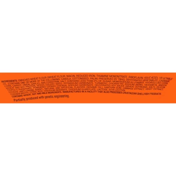 Details Ingredients ENRICHED WHEAT FLOUR (WHEAT FLOUR, NIACIN, REDUCED IRON, THIAMINE MONONITRATE, RIBOFLAVIN, FOLIC ACID), VEGETABLE OIL (CONTAINS ONE OR MORE OF THE FOLLOWING: CANOLA, COTTONSEED, PALM) PRESERVED BY TBHQ, DEHYDRATED VEGETABLES (CABBAGE, CORN, CARROT, ONION, GARLIC), MALTODEXTRIN, SALT, CONTAINS LESS THAN 2% OF: SUGAR, MONOSODIUM GLUTAMATE, HYDROLYZED CORN, WHEAT AND SOY PROTEIN, SPICES (CELERY SEED), TURMERIC, POTASSIUM CARBONATE, CHICKEN FAT, POWDERED COOKED CHICKEN, SODIUM (MONO, HEXAMETA, AND/OR TRIPOLY) PHOSPHATE, SODIUM CARBONATE, SILICON DIOXIDE (ANTI-CAKING AGENT), NATURAL AND ARTIFICIAL FLAVORS (SOYBEAN OIL, SESAME OIL), CABBAGE EXTRACT, XANTHAN GUM, DEHYDRATED SOY SAUCE (WHEAT, SOYBEANS, SALT), YEAST EXTRACT, CHICKEN BROTH, DISODIUM INOSINATE, DISODIUM GUANYLATE, CITRIC ACID, LACTOSE, SOYA LECITHIN. Show more Product features Yakisoba, Chicken Flavor 4 oz (113 g) Home-style Japanese noodles. Ready in minutes. Just add water & microwave - 4 min. www.maruchan.com. Product of USA. Microwave Cooking: 1. Open lid half way only and remove the two packets. 2. Open Packet No. 1 and sprinkle contents in the space between the noodles and container. Gently shake container. 3. Add water to the fill line, as indicated, by arrows. 4. Close lid, cook in a microwave on high (1,000 watts) for 4 minutes (Cooking time may vary based on altitude and power of the microwave. Adjust time as needed.). After cooking, leave product in the microwave for 1 minute to cool. 5. Grab the corners and carefully remove from microwave. Please handle with care, product is very hot. 6. Remove lid, pour in packet No. 2. Mix in the powdered flavoring. Enjoy! Caution: After cooking, container will be extremely hot. Handle with care to avoid spilling or burning yourself. Contains wheat, soy and milk ingredients. Manufactured in a facility that also processes shellfish and fish products. Do not purchase if package is open or torn. 4 oz (113 g) Irvine, CA 92618 Maruchan, Inc. 2011 Yakisoba, Chicken Flavor Home-style Japanese noodles. Ready in minutes. Just add water & microwave - 4 min. www.maruchan.com. Product of USA. Net Quantity of Content 2 X 56.7 g