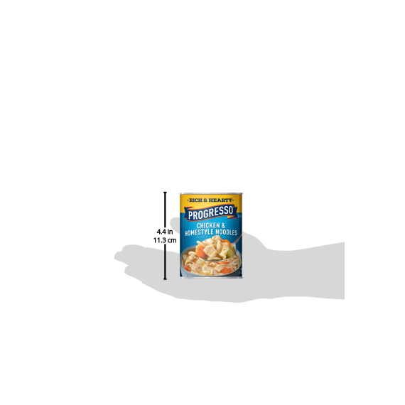 Details Ingredients Chicken Broth, Cooked White Meat Chicken, Carrots, Egg Noodle (Semolina Wheat, Egg*), Celery. Contains Less than 2% of: Water, Modified Food Starch, Chicken Fat, Salt, Corn Starch, Carrot Puree, Egg White*, Potassium Chloride, Sugar, Onion Powder, Soy Protein Isolate, Sodium Phosphate, Tomato Extract, Spice, Garlic Powder, Parsley*, Maltodextrin, Chives*, Flavoring, Beta Carotene (Color).*Dried. Show more Product features Progresso Rich & Hearty Chicken & Homestyle Noodles Soup in a pull top can. Progresso Rich & Hearty Soups are for those moments when you're craving a rich, indulgent, fill-me-up kinda soup. How we fit this much satisfaction into one can, we're not quite sure. Rich. Hearty. Satisfying. Need we say more? Made with White Meat Chicken with No Antibiotics Ever. With out Artificial Flavors, Colors From Artificial Sources or added MSG. This rich and hearty chicken and homestyle noodles soup is packed with classic flavors and quality ingredients for the whole family to enjoy Made with no artificial flavors or colors from artificial ingredients; low fat Instant soups that are ready-to-serve in under 5 minutes; About 2 servings per container Stock your pantry with quality canned soup you can feel good about Try all the delicious options: Traditional, Light, Vegetable Classics, Rich & Hearty, Reduced Sodium Special Features Our most tender chicken ever Net Quantity of Content 2 X 1.0