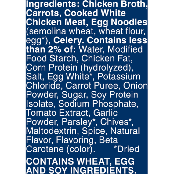 Details Ingredients Chicken Broth, Carrots, Cooked White Chicken Meat, Egg Noodles (Semolina Wheat, Wheat Flour, Egg*), Celery. Contains Less than 2% of: Water, Modified Food Starch, Chicken Fat, Corn Protein (Hydrolyzed), Salt, Egg White*, Potassium Chloride, Carrot Puree, Onion Powder, Sugar, Soy Protein Isolate, Sodium Phosphate, Tomato Extract, Garlic Powder, Parsley*, Chives*, Maltodextrin, Spice, Natural Flavor, Flavoring, Beta Carotene (Color),*Dried. Show more Product features The Progresso Traditional Soups are pretty special. They're the classics. The favorites. All made with quality ingredients and years of practice to get it just right. This traditional Chicken Noodle Soup is made with white meat chicken with no antibiotics ever. It has no artificial flavors or colors from artificial sources. CLASSIC FLAVORS: Hearty chicken soup made with quality ingredients WHOLESOME FOOD: Made with all white meat chicken with no antibiotics ever REAL INGREDIENTS: Our recipe includes no artificial flavors and no colors from artificial sources INSTANT SOUP: Ready-To-Serve in under 5 minutes; About 2 servings per container 19 oz can; Stock your pantry with quality canned soup soup;campbell's soup; campbell's tomato; campbell's prime pantry; prime pantry soup; tomato soup prime pantry; chunky soup; pacific foods soup; Wickedly Prime Chicken Noodle Soup Special Features Approved by best life Net Quantity of Content 2 X 1 cup (242g)