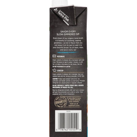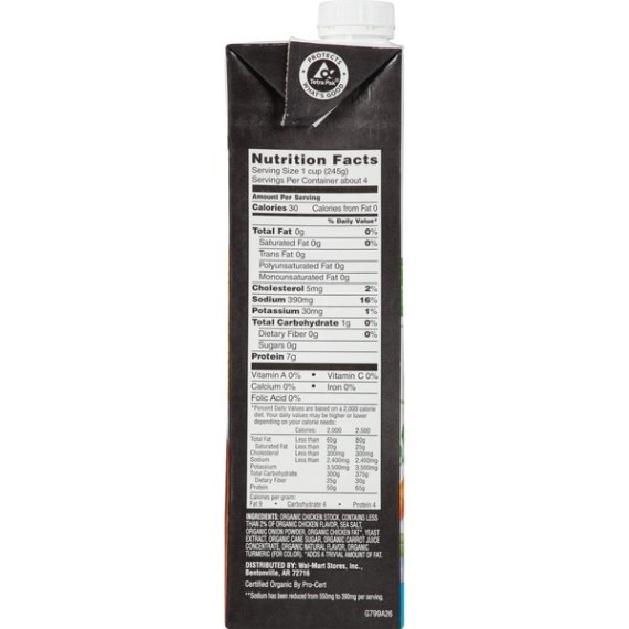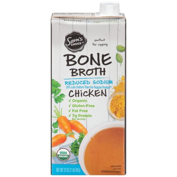 Details Ingredients Organic Chicken Stock, Organic Chicken Flavor, Sea Salt, Organic Onion Powder, Organic Chicken Fat*, Yeast Extract, Organic Cane Sugar, Organic Carrot Juice Concentrate, Organic Naturl Flavor, Organic Turmeric. *Adds A Trivial Amount Of Fat Show more Product features Sam’s Choice Reduced Sodium Chicken Bone Broth is made with slow-simmered organic chicken stock paired with organic onion powder, organic cane sugar, organic carrot juice concentrate, sea salt and organic herbs. Each batch is slow cooked for eight hours to extract and retain all the nutrients and flavors from the high-quality ingredients in the broth to provide you with the best flavor. Enjoy it as a tasty and healthy alternative to tea or coffee in the evenings or use it to add rich flavor and depth to your favorite soups and stews. It can also be used to boil rice, pasta or potato to enhance their flavor. This special pack of chicken broth features 29% less sodium than our regular broth. It’s USDA-certified Organic, gluten-free, fat-free and has 7g protein per serving, making it a healthy addition to your everyday routine. With Sam’s Choice Organic Chicken Broth, you get all the healthy benefits and taste of homemade chicken broth without the time and effort. Named after our iconic founder, Walmart’s Sam’s Choice brand provides families with premium, high quality food and grocery options with the best value. With our wide range of products spanning grocery, packaged food, pre-packaged deli, dairy and frozen food, we offer you a tailored assortment that is both innovative and enticing. Our authentic products are inspired by our proud heritage and are trusted today by the millions of customers using them across the nation. Sam's Choice Bone Broth, Reduced Sodium, Chicken, 32 oz: 32 oz carton of reduced sodium chicken-flavored bone broth Screw on lid helps maintain freshness between uses Broth is USDA organic, gluten-free, and fat-free Ready to serve Ideal for adding a depth of flavor to a variety of dishes or enjoying on its own 30 calories and 7 grams of protein per serving Net Quantity of Content 4 X 1 Cup (245g)