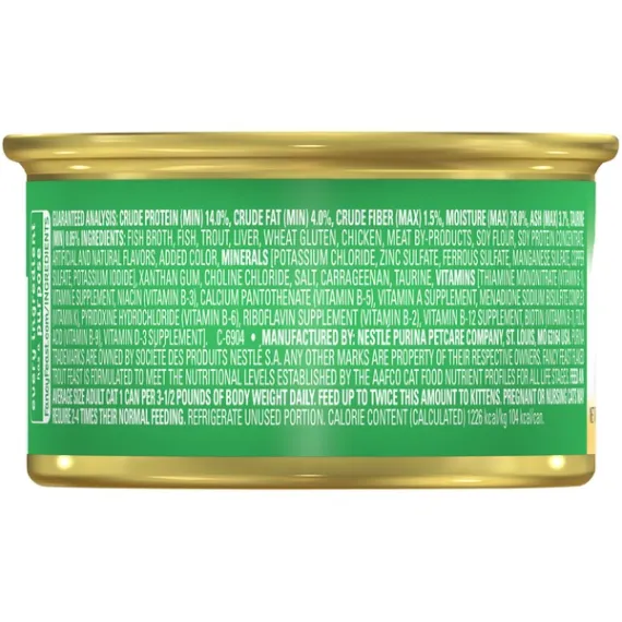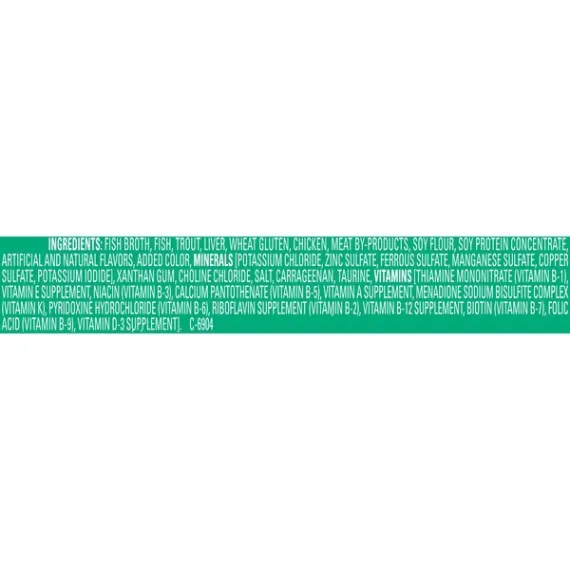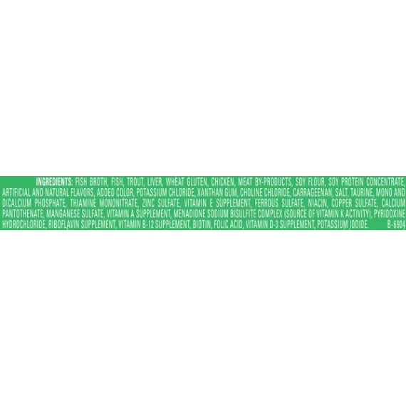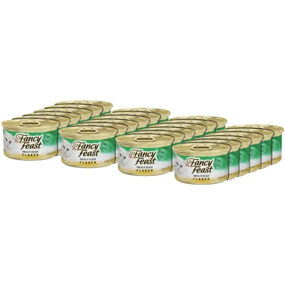 Details Ingredients Fish Broth, Fish, Trout, Liver, Wheat Gluten, Chicken, Meat By-Products, Soy Flour, Soy Protein Concentrate, Artificial and Natural Flavors, Added Color, Potassium Chloride, Xanthan Gum, Choline Chloride, Carrageenan, Salt, Taurine, Mono and Dicalcium Phosphate, Thiamine Mononitrate, Zinc Sulfate, Vitamin E Supplement, Ferrous Sulfate, Niacin, Copper Sulfate, Calcium Pantothenate, Manganese Sulfate, Vitamin A Supplement, Menadione Sodium Bisulfite, Complex (Source of Vitamin K Activity), Pyridoxine Hydrochloride, Riboflavin, Supplement, Vitamin B-12, Supplement, Biotin, Folic Acid, Vitamin D-3 Supplement, Potassium, Iodide. Show more Product features Tempt your cat's taste buds with the irresistible flavor of Purina Fancy Feast Flaked Trout Feast wet cat food. High-quality fish gives her the seafood taste cats crave, and the tender flaked bits provide her with a texture sure to delight her palate. Essential vitamins and minerals help to promote her overall health and wellness, and the scrumptious flakes of fish offer a visual cue letting her know something special is waiting for her at mealtime. Feel good about the food you serve your cat with every can of this gourmet cat food, and take comfort in knowing she's getting 100% complete and balanced nutrition. With quality ingredients and uncompromising taste, this Purina Fancy Feast blend is a true feast worthy of your sophisticated cat. You're careful about what you feed your cat, so choose a trustworthy name when you buy Fancy Feast. Let her experience the full range of flavors found in the Purina Fancy Feast Flaked line for a variety of meals she's sure to lick her paws for. 100% complete and balanced nutrition for adult cats and kittens High-quality fish delivers rich flavor Tender flaked bits create a tempting texture cats crave Essential vitamins and minerals help to support her overall health and wellness Prepared with high-quality ingredients Special Features 100% complete And balanced