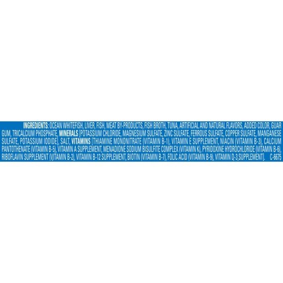 Details Ingredients Ocean Whitefish, Liver, Fish, Meat By-Products, Fish Broth, Tuna, Artificial And Natural Flavors, Added Color, Guar Gum, Tricalcium Phosphate, Minerals [Potassium Chloride, Magnesium Sulfate, Zinc Sulfate, Ferrous Sulfate, Copper Sulfate, Manganese Sulfate, Potassium Iodide], Salt, Vitamins [Thiamine Mononitrate (Vitamin B-1), Vitamin E Supplement, Niacin (Vitamin B-3), Calcium Pantothenate (Vitamin B-5), Vitamin A Supplement, Menadione Sodium Bisulfite Complex (Vitamin K), Pyridoxine Hydrochloride (Vitamin B-6), Riboflavin Supplement (Vitamin B-2), Vitamin B-12 Supplement, Biotin (Vitamin B-7), Folic Acid (Vitamin B-9), Vitamin D-3 Supplement]. C-6675 Show more Product features Satisfy your cat's craving for seafood with Purina Fancy Feast Classic Ocean Whitefish & Tuna Feast wet cat food. This enticing blend of ocean whitefish and tuna creates a delicate taste your choosy cat is sure to love, and the classic pate texture is smooth and soft, creating a pleasurable dining experience. Watch your cat revel in the exceptional taste found in each bite, and rest easy knowing you are giving her a grain-free cat food made with high-quality ingredients. Each serving contains complete and balanced nutrition to support her playful lifestyle, so you can feel good about filling her dish. Show your cat that her happiness is at the top of your priority list when you feed her this delectable gourmet pate cat food and explore our other canned cat food varieties to give her a selection of flavors she'll fall in love with. Depend on the convenience of Walmart.com and get savings that extend the price when ordering quality products like Purina Fancy Feast wet cat food. 100% complete and balanced nutritionHigh-quality ocean whitefish and tuna offer delicious flavorEssential vitamins and minerals help support her healthGrain-free formulaPate recipe provides a smooth texture cats love Special Features Gourmet cat food