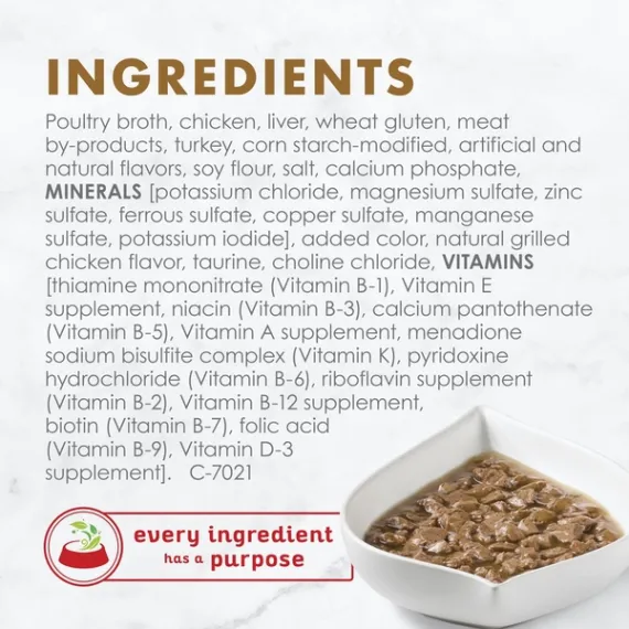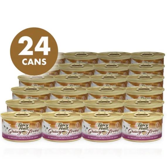Details Ingredients Poultry Broth, Chicken, Liver, Wheat Gluten, Meat By-Products, Turkey, Corn Starch-Modified, Artificial And Natural Flavors, Soy Flour, Salt, Calcium Phosphate, Minerals [Potassium Chloride, Magnesium Sulfate, Zinc Sulfate, Zinc Sulfate, Ferrous Sulfate, Copper Sulfate, Manganese Sulfate, Potassium Iodide], Added Color, Natural Grilled Chicken Flavor, Taurine, Choline Chloride, Vitamins [Thiamine Mononitrate (Vitamin B-1), Vitamin E Supplement, Niacin (Vitamin B-3), Calcium Pantothenate (Vitamin B-5), Vitamin A Supplement, Menadione Sodium Bisulfite Complex (Vitamin K), Pyridoxine Hydrochloride (Vitamin B-6), Riboflavin Supplement (Vitamin B-2), Vitamin B-12 Supplement, Biotin (Vitamin B-7), Folic Acid (Vitamin B-9), Vitamin D-3 Supplement]. C-7021. Show more Product features Let your cat enjoy a true gourmet feast with Purina Fancy Feast Gravy Lovers Chicken Feast in Grilled Chicken Flavor Gravy wet cat food. Savory chicken flavor gives this gourmet soft cat food the taste cats love, and the delicate, slow-cooked bites offer a tempting tender texture. She's sure to love the thick, rich gravy that accompanies every bite, and you can appreciate the essential vitamins and minerals, which help to support her overall health and wellness. With its delectable flavor combination and high-quality ingredients, this Fancy Feast Gravy Lovers canned cat food recipe is one you can feel confident serving to your cat. Each serving delivers 100% complete and balanced nutrition for kittens and adult cats so your feline friend gets the nourishment she needs through every stage of life, from her kitten years to adulthood. You know the meaning of true value and a nutritious pet product. Combine both and spend extra quality time with your cat by ordering Purina Fancy Feast. Savory chicken for the taste cats love Rich, thick gravy for added flavor and moisture Small, delicate bites offer a tempting texture Essential vitamins and minerals to help support her overall health and wellness 100% complete and balanced nutrition for kittens and adult cats Special Features 100% complete & balanced. For kittens & adult cats. Aluminum recyclable. Please recycle. Ask Purina at Purina.com or call 1-800-933-0991 M-F, 7am to 7pm CT. Fancy Feast Gravy Lovers Chicken Feast in Grilled Chicken Flavor Gravy is formulated to meet the nutritional levels established by the AAFCO Cat Food Nutrient Profiles for growth of kittens and maintenance of adult cats. Please recycle.