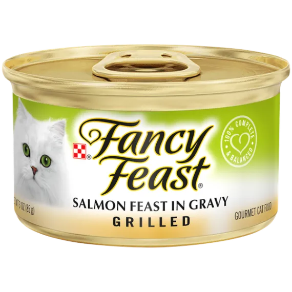 Details Ingredients Fish Broth, Salmon, Liver, Wheat Gluten, Meat By-Products, Chicken, Corn Starch-Modified, Artificial And Natural Flavors, Salt, Tricalcium Phosphate, Added Color, Soy Protein Concentrate, Minerals [Potassium Chloride, Magnesium Sulfate, Zinc Sulfate, Ferrous Sulfate, Copper Sulfate, Manganese Sulfate, Potassium Iodide], Red 3, Taurine, Choline Chloride, Vitamins [Thiamine Mononitrate (Vitamin B-1), Vitamin E Supplement, Niacin (Vitamin B-3), Calcium Pantothenate (Vitamin B-5), Vitamin A Supplement, Menadione Sodium Bisulfite Complex (Vitamin K), Pyridoxine Hydrochloride (Vitamin B-6), Riboflavin Supplement (Vitamin B-2), Vitamin B-12 Supplement, Biotin (Vitamin B-7), Folic Acid (Vitamin B-9), Vitamin D-3 Supplement]. D-6926 Show more Product features Offer your fabulous feline a gourmet meal befitting her place in your heart with Purina Fancy Feast Grilled Salmon Feast in Gravy wet cat food. From the moment she hears the can opener, she'll be at your feet for the delicious feast of grilled salmon in a savory gravy. This premium wet cat food provides 100% complete and balanced nutrition in a sophisticated blend made for her tastes. The culinary catch features tender chunks of slow-grilled salmon that she can sink her teeth into, and the light gravy adds just a touch of delicious background for a great taste cats love. With essential vitamins and minerals to help support her whole-body health, this Fancy Feast cat food recipe lets you give her good food in a pleasing presentation. Serve her Purina Fancy Feast Grilled Salmon Feast in Gravy with a sprig or two of cat grass for a truly fancy feast. You know the meaning of true value and a quality product, so give your cat the taste and quality she deserves when you order Fancy Feast. Tender grilled chunks of salmon provide texture 100% complete and balanced nutrition for cats Light delicious gravy that cats love Essential vitamins and minerals help support her overall health Slow-grilled delicious salmon flavor Special Features In gravy