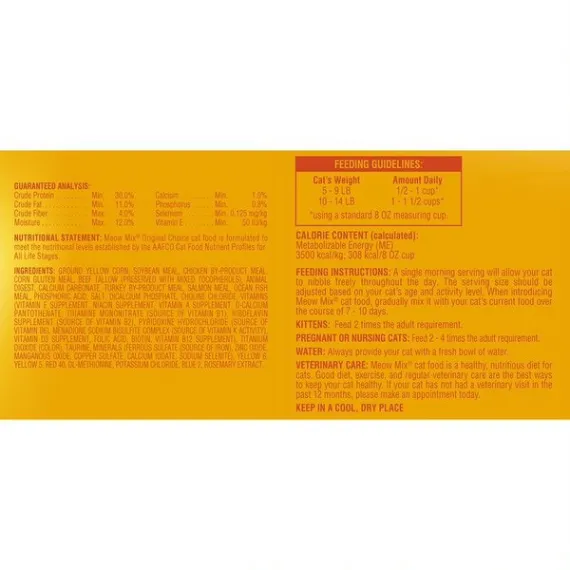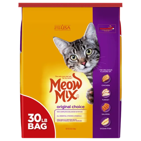 Details Ingredients Ground Yellow Corn, Soybean Meal, Chicken By-Product Meal, Corn Gluten Meal, Beef Tallow (Preserved with Mixed Tocopherols), Animal Digest, Calcium Carbonate, Turkey By-Product Meal, Salmon Meal, Ocean Fish Meal, Phosphoric Acid, Salt, Dicalcium Phosphate, Choline Chloride, Vitamins (Vitamin E Supplement, Niacin Supplement, Vitamin A Supplement, D-Calcium Pantothenate, Thiamine Mononitrate (Source of Vitamin B1), Riboflavin Supplement (Source of Vitamin B2), Pyridoxine Hydrochloride (Source of Vitamin B6), Menadione Sodium Bisulfite Complex (Source of Vitamin K Activity), Vitamin D3 Supplement, Folic Acid, Biotin, Vitamin B12 Supplement), Titanium Dioxide (Color), Taurine, Minerals (Ferrous Sulfate (Source of Iron), Zinc Oxide, Manganous Oxide, Copper Sulfate, Calcium Iodate, Sodium Selenite), Yellow 6, Yellow 5, Red 40, Dl-Methionine, Potassium Chloride, Blue 2, Rosemary Extract. Show more Product features Keep your favorite feline healthy and happy with a palate-pleasing bowl of Meow Mix. Formulated to meet the daily nutritional needs of a cat, it contains a select blend of essential vitamins and minerals for overall health. It also contains high-quality protein that helps support strong, healthy muscles. This Meow Mix cat food has a mix of tasty flavors, including chicken, turkey, salmon and ocean fish. It's available in your choice of weights, ranging from 3.15 lb up to 30 lb Try other Meow Mix flavor combinations like Bistro Recipes or Tender Center (sold separately) to mix up the fun. It's the only one cats ask for by name. Meow Mix Original Choice Dry Cat Food, 30 lb: Dry cat food Original mix 100% complete and balanced nutrition; with vitamins, minerals antioxidants Contains delicious flavors of chicken, turkey, salmon and ocean fish All essential vitamins and minerals support overall health Crunchy texture helps reduce plaque and tartar buildup High-quality protein helps support strong, healthy muscles The only one cats ask for by name Life stage: adult Net weight: 30 lbs. Also available in 3.15 lb, 6.3 lb, 16 lb and 22 lb sizes Try other Meow Mix dry food flavor combinations and textures (sold separately) Special Features The delicious flavors of: chicken; salmon; turkey; ocean fish. Essential nutrients and antioxidants. High quality ingredients. 100% complete nutrition. 30 lb bag. The only one cats ask for by name. Irresistible taste cats love! Original Choice: Essential nutrients and minerals your cat needs every day. High quality protein to support a lean, energetic body. Antioxidants to support a long, healthy life. Calorie Content (Calculated): Metabolizable energy (ME): 3500 kcal/kg; 308 kcal/8 oz cup. Nutritional Statement: Meow Mix Original Choice cat food is formulated to meet the nutritional levels established by the AAFCO Cat Food Nutrient Profiles for All Life Stages. Questions or Comments: Visit our website at www.meowmix.com or call 1-877-Meow-Mix (1-877-636-9649) weekdays, with the information contained in the guaranteed fresh if used by date box. www.meowmix.com. Packed with pride in USA.