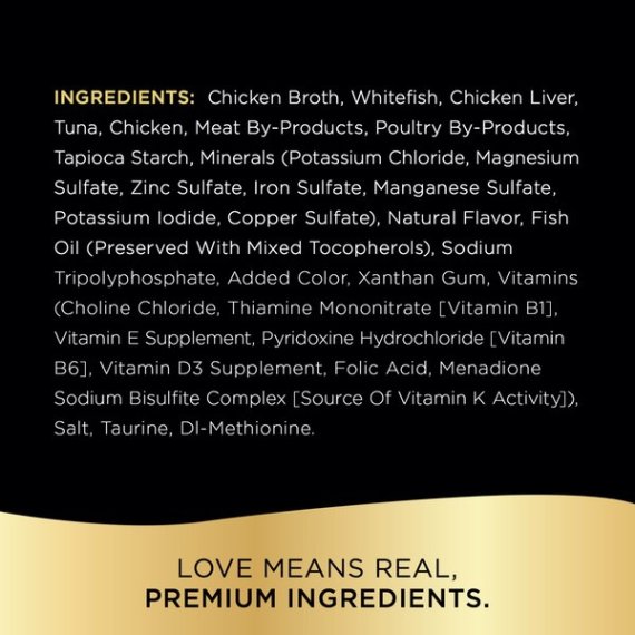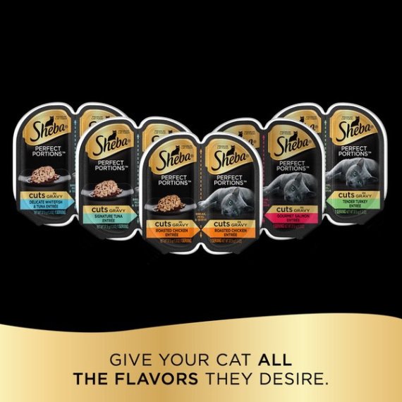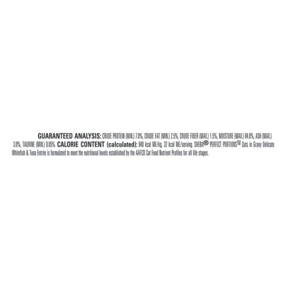 Details Ingredients Chicken Broth, Whitefish, Chicken Liver, Tuna, Chicken, Meat By-Products, Poultry By-Products, Tapioca Starch, Minerals (Potassium Chloride, Magnesium Sulfate, Zinc Sulfate, Iron Sulfate, Manganese Sulfate, Potassium Iodide, Copper Sulfate), Natural Flavor, Fish Oil (Preserved with Mixed Tocopherols), Sodium Tripolyphosphate, added Color, Xanthan Gum, Vitamins (Choline Chloride, Thiamine Mononitrate [Vitamin B1], Vitamin E Supplement, Pyridoxine Hydrochloride, [Vitamin B6], Vitamin D3 Supplement, Folic Acid, Menadione Sodium Bisulfite Complex [Source Of Vitamin K Activity]), Salt, Taurine, Dl-Methionine. Show more Product features Your cat knows what they want, and knows how to get it. Give them SHEBA Wet Cat Food. Each SHEBA Cuts in Gravy recipe is made with real protein, essential vitamins, and minerals, so it’s as nutritious as it is delicious. This wet cat food is made without corn and artificial flavors or preservatives; and since it’s so delectable and easy to chew, your cat will devour every tasty bite. SHEBA PERFECT PORTIONS Cuts in Gravy Wet Cat Food offers two convenient servings in right-sized trays to ensure freshness without leftovers. Show your cat some love; whether your fancy feline is a kitten, adult, or senior cat, this soft wet food is sure to satisfy even the pickiest appetite. Savor every delicious moment with SHEBA Wet Cat Food: What Cats Want. Contains one (1) 2.6 oz. twin pack tray (2 servings total) of SHEBA PERFECT PORTIONS Wet Cat Food Cuts in Gravy Delicate Whitefish and Tuna Entree Made with real protein, plus essential vitamins and minerals for cat maintenance and kitten growth Delectable soft cat food made without grain - no corn, soy, or wheat Your cat will devour the delicious taste of premium SHEBA Wet Cat Food in Gravy Trays Freshness at every meal with no messy leftovers: Just snap, peel, and serve to your adult cat