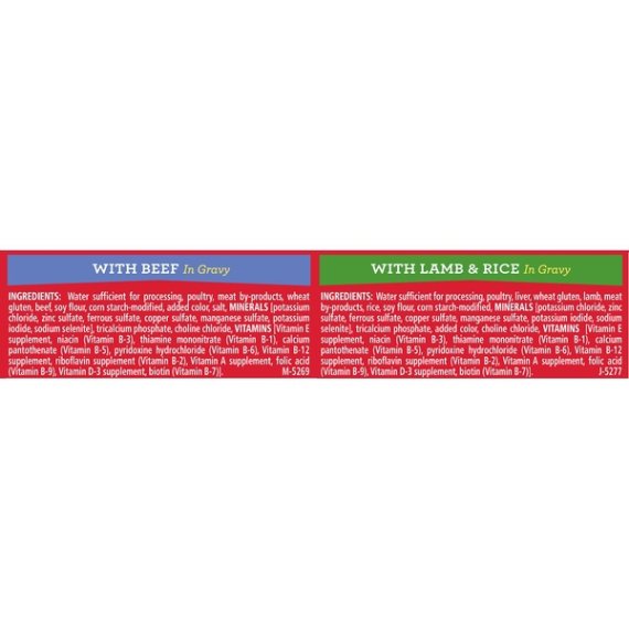 Details Ingredients Water sufficient for processing, poultry, meat by-products, wheat gluten, beef, soy flour, corn starch-modified, added color, salt, MINERALS [potassium chloride, zinc sulfate, ferrous sulfate, copper sulfate, manganese sulfate, potassium iodide, sodium selenite], tricalcium phosphate, choline chloride, VITAMINS [Vitamin E supplement, niacin (Vitamin B-3), thiamine mononitrate (Vitamin B-1), calcium pantothenate (Vitamin B-5), pyridoxine hydrochloride (Vitamin B-6), Vitamin B-12 supplement, riboflavin supplement (Vitamin B-2), Vitamin A supplement, folic acid (Vitamin B-9), Vitamin D-3 supplement, biotin (Vitamin B-7)]. M-5269 Water sufficient for processing, poultry, liver, wheat gluten, lamb, meat by-products, rice, soy flour, corn starch-modified, MINERALS [potassium chloride, zinc sulfate, ferrous sulfate, copper sulfate, manganese sulfate, potassium iodide, sodium selenite], tricalcium phosphate, added color, choline chloride, VITAMINS [Vitamin E supplement, niacin (Vitamin B-3), thiamine mononitrate (Vitamin B-1), calcium pantothenate (Vitamin B-5), pyridoxine hydrochloride (Vitamin B-6), Vitamin B-12 supplement, riboflavin supplement (Vitamin B-2), Vitamin A supplement, folic acid (Vitamin B-9), Vitamin D-3 supplement, biotin (Vitamin B-7)]. J-5277 Show more Product features Stock up on more of the flavors that get your dog excited about mealtime with this Purina ALPO Prime Cuts wet dog food variety pack. Two irresistible recipes deliver the meaty goodness he loves, and real beef or lamb in each can lets you rest easy knowing your canine companion is getting meals made with high-quality ingredients. Each steakhouse-inspired variety features a rich, savory gravy to tempt his taste buds, and 23 essential vitamins and minerals in every serving support his overall health and wellness. The tender chunks give this wet dog food a tempting texture your canine companion can happily sink his teeth into, and each recipe contains high-quality sources of protein. Give your dog the 100% complete and balanced nutrition for adult dogs he needs and spend less time worrying about finding quality dog food when you order a Purina ALPO Prime Cuts wet dog food variety pack. Spend more priceless moments with your dog. We'll cover the rest. Made with real beef or lamb Contains high-quality protein sources Delivers 100% complete and balanced nutrition for adult dogs Formulated with 23 essential vitamins and minerals In savory gravy Special Features Prime cuts in gravy
