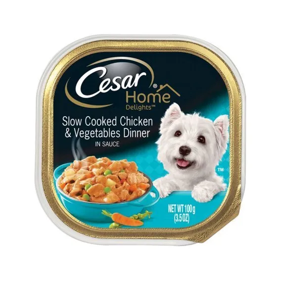 Details Ingredients Sufficient Water for Processing, Chicken, Chicken Liver, Meat By-Products, Wheat Gluten, Starch, Dried Potatoes, Wheat Flour, Dried Carrots, Dried Peas, Pea Fiber, Minerals (Potassium Chloride, Calcium Carbonate, Magnesium Proteinate, Zinc Sulfate, Copper Sulfate, Potassium Iodide), Salt, Natural Flavor, Sodium Tripolyphosphate, Vitamins (Choline Chloride, Vitamin E Supplement, Biotin, D-Calcium Pantothenate, Thiamine Mononitrate [Vitamin B1], Vitamin B12 Supplement, Riboflavin [Vitamin B2], Vitamin A Supplement, Vitamin D3 Supplement, Pyridoxine Hydrochloride), Added Color, Xanthan Gum, Guar Gum, Sodium Nitrite (for Color Retention). Show more Product features Keep your pooch healthy and well fed with Cesar Home Delights Dog Food Chicken & Vegetables. It's formulated to meet your pets' nutritional needs as well as satisfy their taste buds. Contains one (1) 36 count case of 3.5 oz. trays of CESAR Wet Dog Food HOME DELIGHTS and Classic Loaf in Sauce Variety Pack: HOME DELIGHTS: (6) Beef Stew, (6) Slow Cooked Chicken and Vegetable Dinner in Sauce, (6) Pot Roast with Spring Vegetables Dinnerin Sauce; Classic Loafs in Sauce: (6) Filet Mignon Flavor, (6) Porterhouse Steak Flavor, and (6) Grilled Chicken Flavor (May receive new or old packaging) Crafted with US Chicken or US Beef as the #1 ingredient CESAR Wet Dog Food is complete and balanced and fortified with vitamins and minerals to help dogs of all sizes, especially small breeds, stay healthy Cesar makes a great meal on its own or as a dog food topper mixed with dry food This gourmet dog food is served in convenient trays with easy, peel-away freshness seals Special Features Cesar Home Delights Slow Cooked Chicken and Vegetables Dinner in Sauce is guaranteed to tempt even the fussiest eater. If not satisfied, copy code and state price paid. Nutritional Guarantee: Cesar Home Delights Slow Cooked Chicken and Vegetables Dinner in Sauce is formulated to meet the nutritional levels established by the AAFCO Dog Food Nutrient Profiles for Maintenance. Calorie Content (calculated): 780 kcal ME/kg, 78 kcal/ME tray. Questions or comments? 1-800-525-5273.