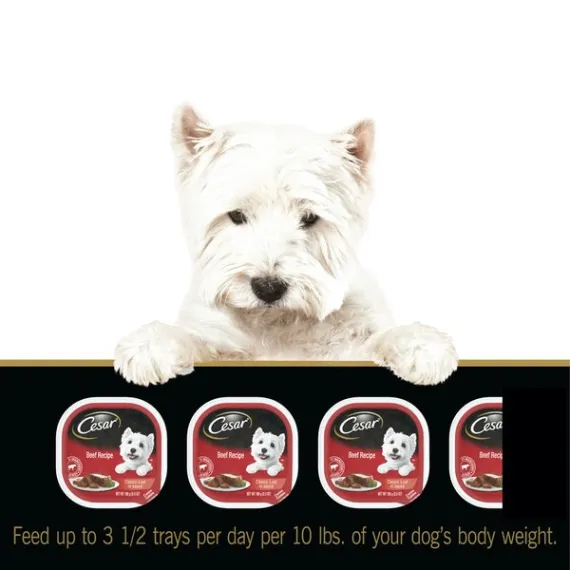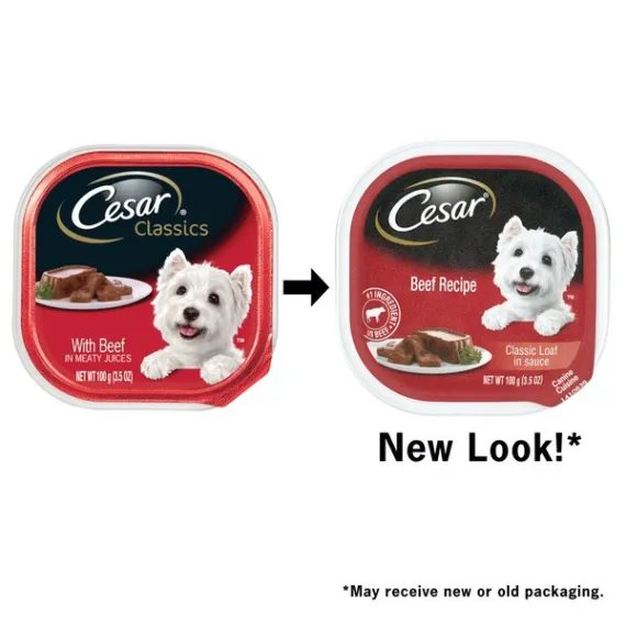 Details Ingredients Sufficient water for processing, beef by-products, liver, meat by-products, beef, chicken, chicken by-products, calcium carbonate, added color, natural flavors, sodium tripolyphosphate, carrageenan, dried yam, xanthan gum, potassium chloride, salt, erythorbic acid, top sirloin flavor, guar gum, zinc sulfate, sodium nitrite (for color retention), vitamin A, D3 and E supplements, d-calcium pantothenate, thiamine mononitrate (vitamin B1). Show more Product features Dogs love the great taste of CESAR wet dog food. Crafted without grains and with US Beef as the #1 ingredient, CESAR Beef Recipe Classic Loaf in sauce is guaranteed to tempt even the fussiest eater. CESAR CANINE CUISINE provides the complete and balanced nutrition your dog needs, with the taste and variety they can't resist. The CESAR brand always makes mealtime easy with convenient trays and no-fuss, peel-away freshness seals. Our gourmet wet dog food uses ingredients formulated to meet nutritional levels established by the AAFCO dog food nutrient profiles for maintenance. Spoil the dog you love with CESAR wet dog food. Contains one (1) 3.5 oz. tray of CESAR Wet Dog Food Classic Loaf in Sauce Beef Recipe (May receive new or old packaging) Crafted without grains and with real meat, US Beef as the #1 Ingredient CESAR Wet Dog Food is complete and balanced and fortified with vitamins and minerals to help dogs of all sizes, especially small breeds, stay healthy Cesar makes a great meal on its own or as a dog food topper mixed with dry food This gourmet dog food is served in convenient trays with easy, peel-away freshness seals Special Features Canine cuisine