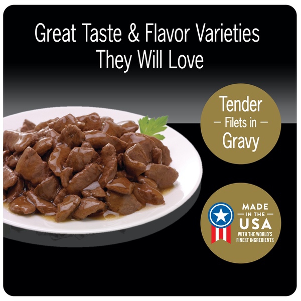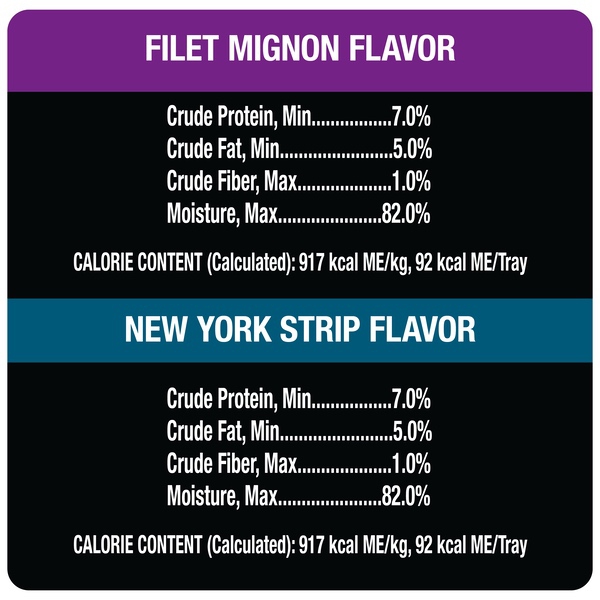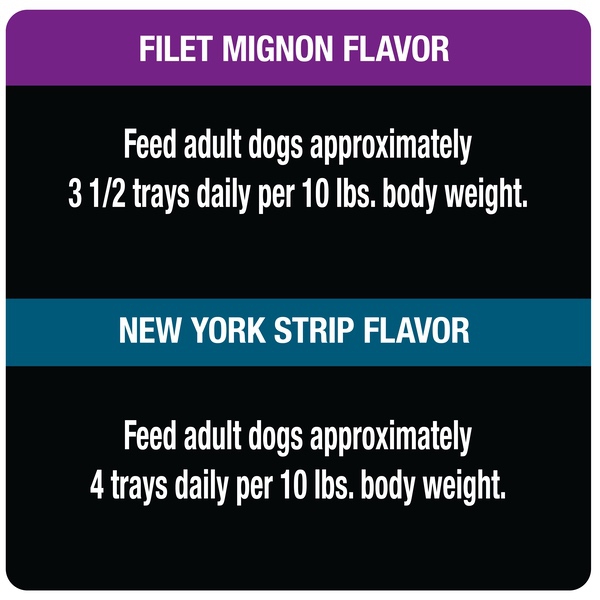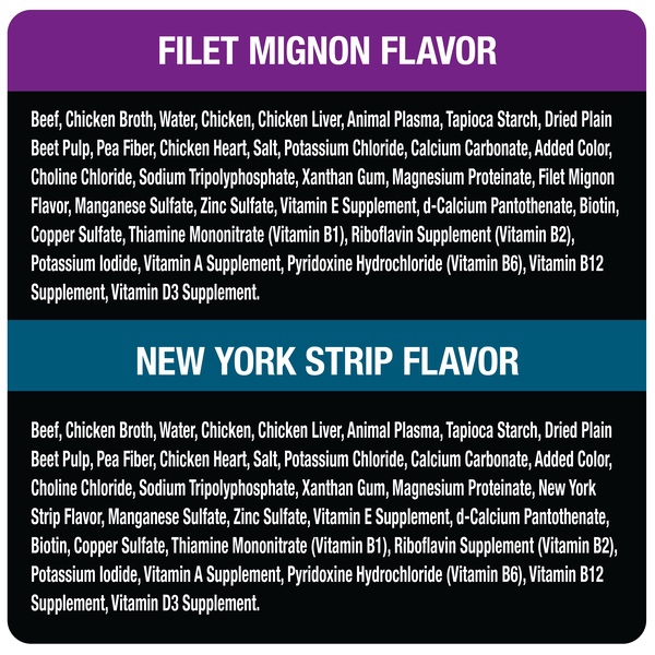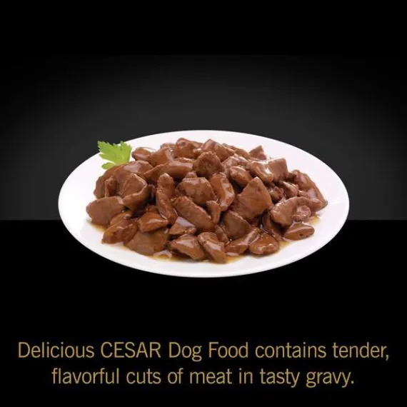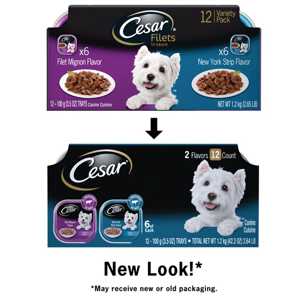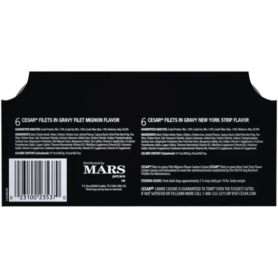 Details Ingredients Sufficient Water For Processing, Chicken, Animal Liver, Beef, Meat By-Products, Wheat Gluten, Starch, Wheat Flour, Pea Fiber, Minerals (Potassium Chloride, Calcium Carbonate, Magnesium Proteinate, Zinc Sulfate, Copper Sulfate, Potassium Iodide), Salt, Sodium Tripolyphosphate, Added Color, Vitamins (Choline Chloride, Vitamin E Supplement, Biotin, D-Calcium Pantothenate, Thiamine Mononitrate [Vitamin B1], Vitamin B12 Supplement, Riboflavin [Vitamin B2], Vitamin A Supplement, Vitamin D3 Supplement, Pyridoxine Hydrochloride), Natural Flavor, Xanthan Gum, Natural New York Strip Flavor, Guar Gum. Show more Product features Dogs with sophisticated palates will enjoy a rich culinary experience with CESAR Filets in gravy Wet Dog Food. From large to small dogs, indulge your pampered pooch with savory dog food featuring US Beef as the #1 ingredient, and Filet Mignon and New York Strip flavors that make their mouth water and tail wag. CESAR Filets in gravy Variety Pack Dog Food delights with a tantalizing filet texture, and is enhanced with vitamins and minerals for complete and balanced nutrition. Served in convenient trays with no-fuss, peel-away freshness seals, CESAR Adult Dog Food makes mealtime easy. Our gourmet wet dog food also uses ingredients formulated to meet nutritional levels established by the AAFCO dog food nutrient profiles for maintenance. Contains one (1) 12 count case of 3.5 oz. trays of CESAR Filets in gravy Variety Pack Wet Dog Food: (6) Filet Mignon & (6) New York Strip Flavors Crafted with real meat, US Beef as the #1 Ingredient CESAR Wet Dog Food is complete and balanced and fortified with vitamins and minerals to help dogs of all sizes, especially small breeds, stay healthy Cesar makes a great meal on its own or as a dog food topper mixed with dry food This gourmet dog food is served in convenient trays with easy, peel-away freshness seals Special Features Gourmet filets in sauce