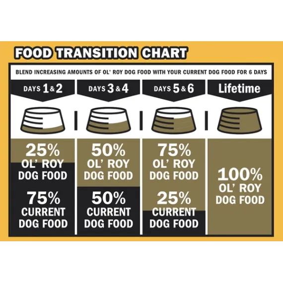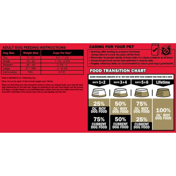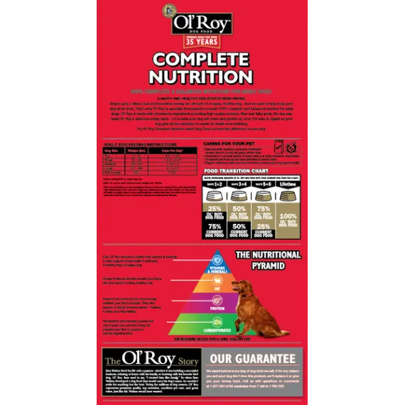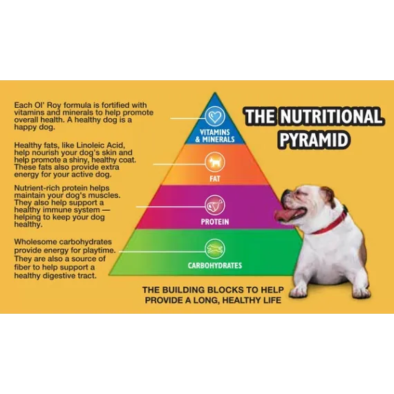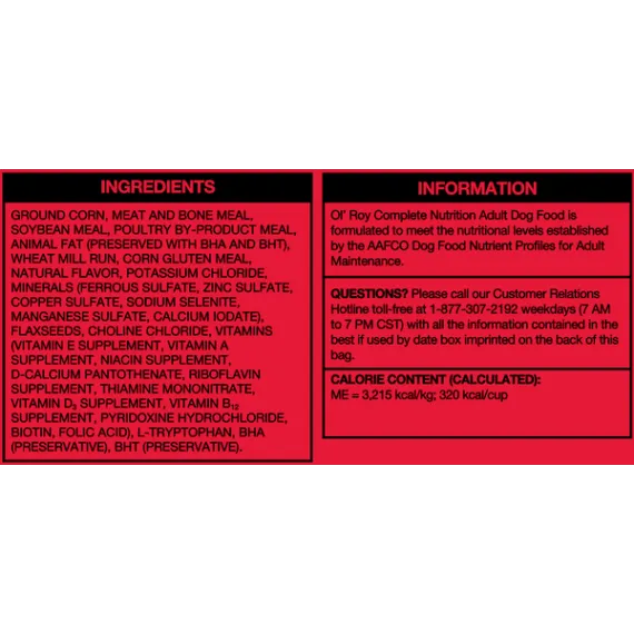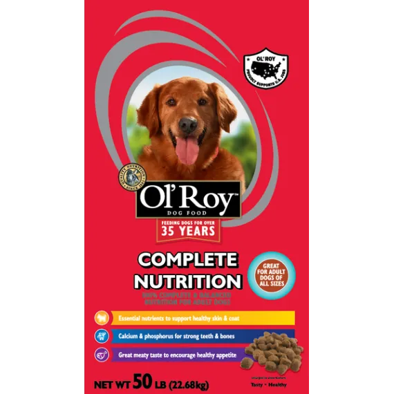 Show more Product features A happy and healthy dog starts from within. Bright eyes, a shiny coat and boundless amounts of energy are all traits of a happy, healthy dog. And we want to help keep your dog at his best. That's why Ol' Roy is specially formulated to provide 100% complete and balanced nutrition for adult dogs. Ol' Roy is made with wholesome ingredients like high quality proteins, carbohydrates and essential fatty acids. No dog can resist Ol' Roy's delicious meaty taste - it's a taste your dog will crave and gobble up. And, it's easy to digest so your dog gets all the nutrients he needs to live a long and healthy life. The Nutritional Pyramid Vitamins & Minerals Each Ol' Roy formula is fortified with vitamins & minerals to help promote overall health & longevity. A healthy dog is a happy dog. Fat Healthy fats, containing omega 6 fatty acids, help nourish your dog's skin and promote a shiny, healthy coat. These fats also provide extra energy for your active dog. Protein Nutrient-rich animal proteins help maintain and repair your dog's muscles. They also support a healthy immune system helping to keep your dog healthy. Carbohydrates Wholesome carbohydrates, like whole grain corn provide energy for playtime. They are also a source of fiber to support a healthy digestive tract. The building blocks for a long, healthy life Nutritional Guarantee: Ol' Roy Complete Nutrition Dog Food is formulated to meet the nutritional levels established by the AAFCO Dog Food Nutrient Profiles for adult maintenance. Feed your furry best friend well with Ol' Roy Complete Nutrition Dog Food. With complete and balanced nutrition, this food is a healthy and satisfying meal for adult dogs of all sizes. This dog food contains essential nutrients to promote healthy skin and coat, as well as calcium and phosphorus for strong teeth and bones. Treat your pal to great meals with Ol' Roy Complete Nutrition Dog Food. Feeding dogs for over 35 years Quality nutrition since 1981 Try Ol' Roy Complete Nutrition dog food and see the difference in your dog. The Ol' Roy Story Sam Walton lived his life with a passion - whether it was building a successful business, relaxing at home with his family, or hunting with his favorite bird dog, Ol' Roy. Sam used to say, "I treated him like family." So when Sam Walton developed a dog food that would carry his dog's name, he wouldn't settle for anything but the best. Today, for millions of dogs owners, Ol' Roy represents premium quality, top nutrition, excellent pet care, and great value. Just like Mr. Walton would have wanted. Sam Walton lived his life with a passion â whether it was building a successful business, relaxing at home with his family, or hunting with his favorite bird dog, Ol' Roy. Sam used to say, "I treated him like family." So when Sam Walton developed a dog food that would carry his dog's name, he wouldn't settle for anything but the best. Today, for millions of dog owners, Ol' Roy represents premium quality, top nutrition, excellent pet care, and great value. Just like Mr. Walton would have wanted. Improved formula Great for adult dogs of all sizes 100% complete & balanced nutrition for adult dogs Essential nutrients to promote healthy skin & coat Calcium & phosphorus for strong teeth & bones Formulated with no artificial colors or flavors Tasty, healthy Special Features Tasty, healthyNo reviews found