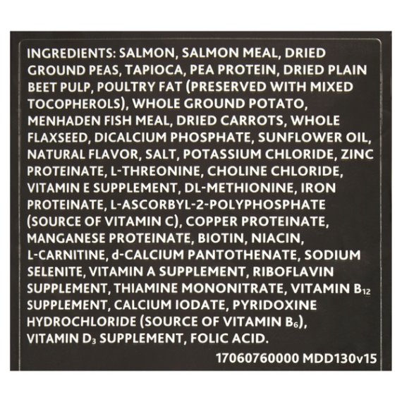 Details Ingredients Salmon, Salmon Meal, Dried Ground Peas, Tapioca, Pea Protein, Fish Meal, Dried Plain Beet Pulp, Poultry Fat (Preserved with Mixed Tocopherols), Dried Carrots, Sunflower Oil, Natural Flavor, Whole Potato, Calcium Carbonate, Salt, Flaxseed, Potassium Chloride, Zinc Proteinate, Vitamin E Supplement, Iron Proteinate, Choline Chloride, L-Ascorbyl-2-Polyphosphate (source of Vitamin C), Manganese Proteinate, Copper Proteinate, Niacin, D-Calcium Pantothenate, L-Carnitine, Biotin, Sodium Selenite, Vitamin A Supplement, Riboflavin Supplement, Thiamine Mononitrate, Vitamin B12 Supplement, Calcium Iodate, Pyridoxine Hydrochloride (source of Vitamin B6), Vitamin D3 Supplement, Folic Acid Show more Product features Pure Balance believes in one pure and simple thought â the best nutrition for your dog starts with the best ingredients. Pure Balance Grain Free Salmon & Pea Recipe is made with carefully selected ingredients to ensure your dog gets all the nutrition he needs without any of the extra stuff he doesn't. This Grain Free recipe contains no corn, wheat, soy or grains making this ideal for dogs with food sensitivities. The first ingredient is real salmon, which helps build lean muscle mass in your dog so he can run, jump and play. And peas which deliver a natural source of fiber as well as carrots which offer beta-carotene to help support healthy eyes. Antioxidants like vitamins E and C help support and keep your dog's heart & immune system healthy. Pure Balance Wild & Free Grain-Free Salmon & Pea Recipe Dry Dog Food, 11 lb: Salmon is the first ingredient No Corn, Wheat, or Soy Recipe Natural ingredients with added vitamins and minerals No artificial flavors, artificial preservatives, or artificial colors var _mtm = _mtm || []; _mtm.push({'mtm.startTime': (new Date().getTime()), 'event': 'mtm.Start'}); var d=document, g=d.createElement('script'), s=d.getElementsByTagName('script')[0]; g.type='text/javascript'; g.async=true; g.defer=true; g.src='https://cdn.matomo.cloud/brandsmart.matomo.cloud/container_toV0xON3.js'; s.parentNode.insertBefore(g,s); Special Features Support for food sensitivity, healthy vision, and healthy heart