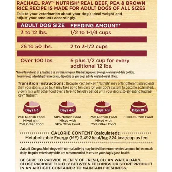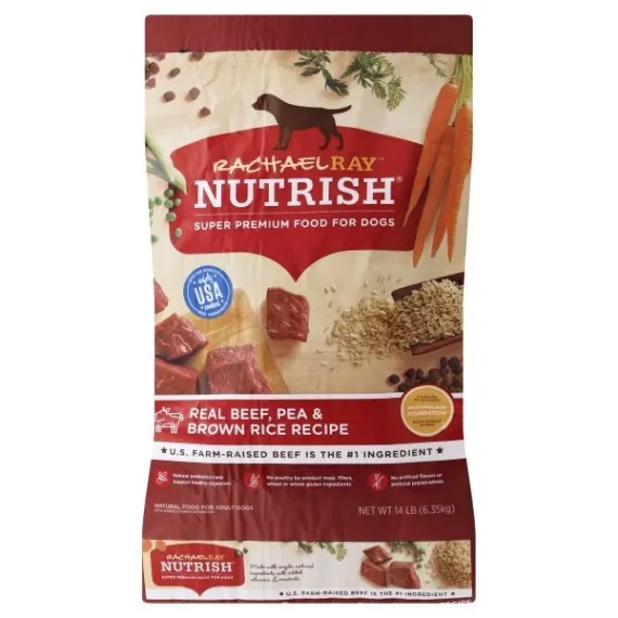 Details Ingredients Beef, Beef Meal, Dried Peas, Soybean Meal, Whole Ground Corn, Chicken Fat (Preserved with Mixed Tocopherols), Dried Plain Beet Pulp, Pea Starch, Corn Gluten Meal, Brown Rice, Natural Flavor, Salt, Alfalfa Nutrient Concentrate, Dried Carrots, Zinc Sulfate, Vitamin E Supplement, Calcium Carbonate, Iron Sulfate, Beet Powder (Color), L-ascorbyl-2-polyphosphate (Source of Vitamin C), Choline Chloride, Biotin, Niacin, Copper Sulfate, Manganese Sulfate, Selenium Supplement, D-calcium Pantothenate, Vitamin A Supplement, Riboflavin Supplement, Vitamin B12 Supplement, Menadione Sodium Bisulfite Complex (Source of Vitamin K), Thiamine Mononitrate, Pyridoxine Hydrochloride, Potassium Iodide, Vitamin D3 Supplement, Folic Acid. Show more Product features Rachael Ray Nutrish Real Beef & Brown Rice Recipe is made with simple, natural ingredients, like real U.S. farm-raised beef, which is always the number one ingredient, combined with wholesome brown rice, vegetables and added vitamins & minerals. U.S. farm-raised beef is the #1 ingredient Natural prebiotics help support healthy digestion No artificial flavors or artificial preservatives No poultry by-product meal, filler, wheat, or wheat gluten ingredients Natural dog food with added vitamins & minerals Safely USA cooked with the world's best ingredients Special Features Yes