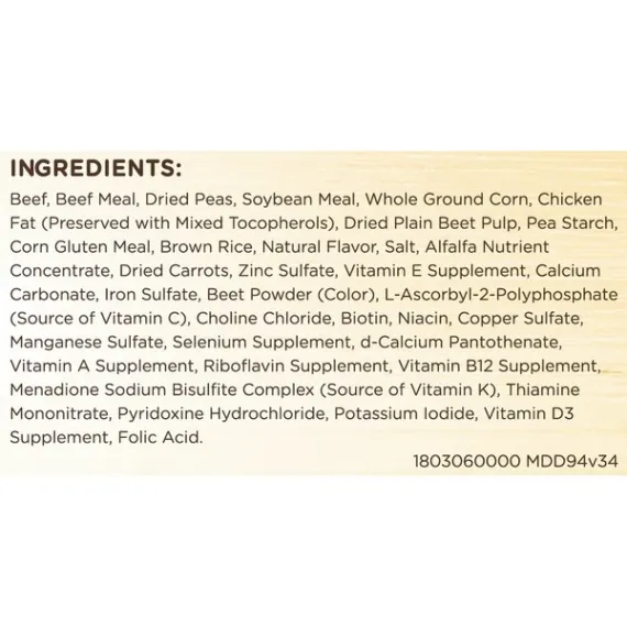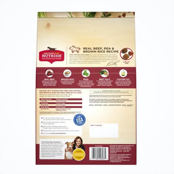 Details Ingredients Beef, Beef Meal, Dried Peas, Soybean Meal, Whole Ground Corn, Chicken Fat (Preserved with Mixed Tocopherols), Dried Plain Beet Pulp, Pea Starch, Corn Gluten Meal, Brown Rice, Natural Flavor, Salt, Alfalfa Nutrient Concentrate, Dried Carrots, Zinc Sulfate, Vitamin E Supplement, Calcium Carbonate, Iron Sulfate, Beet Powder (Color), L-ascorbyl-2-polyphosphate (Source of Vitamin C), Choline Chloride, Biotin, Niacin, Copper Sulfate, Manganese Sulfate, Selenium Supplement, D-calcium Pantothenate, Vitamin A Supplement, Riboflavin Supplement, Vitamin B12 Supplement, Menadione Sodium Bisulfite Complex (Source of Vitamin K), Thiamine Mononitrate, Pyridoxine Hydrochloride, Potassium Iodide, Vitamin D3 Supplement, Folic Acid. Show more Product features Rachael Ray Nutrish Real Beef & Brown Rice Recipe is made with simple, natural ingredients, like real U.S. farm-raised beef, which is always the number one ingredient, combined with wholesome brown rice, vegetables and added vitamins & minerals. U.S. farm-raised beef is the #1 ingredient Natural prebiotics help support healthy digestion No artificial flavors or artificial preservatives No poultry by-product meal, filler, wheat, or wheat gluten ingredients Natural dog food with added vitamins & minerals Safely USA cooked with the world's best ingredients Special Features Yes