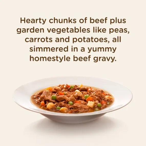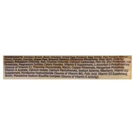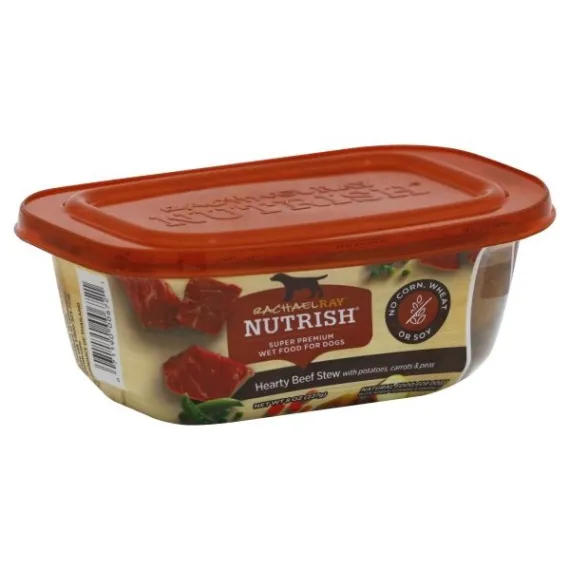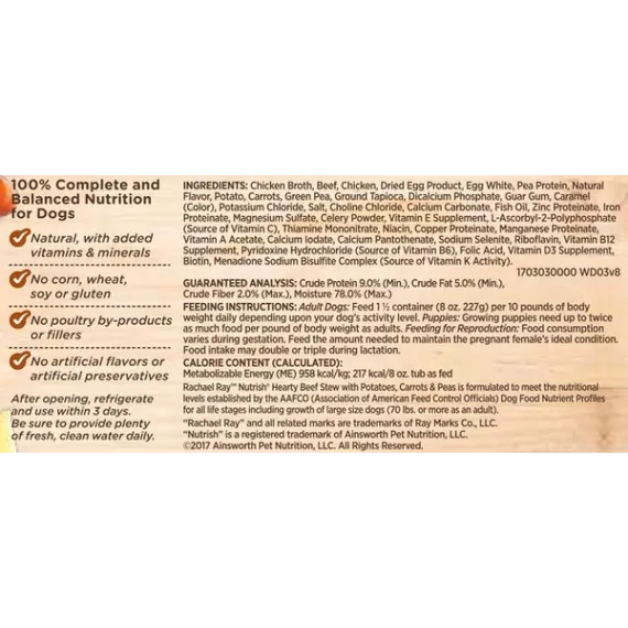 Details Ingredients Chicken Broth, Beef, Chicken, Dried Egg Product, Egg White, Pea Protein, Natural Flavor, Potato, Carrots, Green Pea, Ground Tapioca, Dicalcium Phosphate, Guar Gum, Caramel (Color), Potassium Chloride, Salt, Choline Chloride, Calcium Carbonate, Fish Oil, Zinc Proteinate, Iron Proteinate, Magnesium Sulfate, Celery Powder, Vitamin E Supplement, L-ascorbyl-2-polyphosphate (Source of Vitamin C), Thiamine Mononitrate, Niacin, Copper Proteinate, Manganese Proteinate, Vitamin A Acetate, Calcium Iodate, Calcium Pantothenate, Sodium Selenite, Riboflavin, Vitamin B12 Supplement, Pyridoxine Hydrochloride (Source of Vitamin B6), Folic Acid, Vitamin D3 Supplement, Biotin, Menadione Sodium Bisulfite Complex (Source of Vitamin K Activity). Show more Product features Rachael Ray Nutrish Hearty Beef Stew Recipe is made with hearty chunks of beef plus garden vegetables like peas, carrots and potatoes, all simmered in a yummy homestyle beef gravy. Made with hearty chunks of beef and wholesome veggies No artificial flavors or artificial preservatives Natural wet dog food with added vitamins and minerals