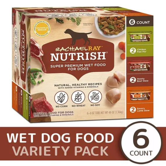 Details Ingredients Hearty Beef Stew, Chicken Paw Pie, Savory Lamb Stew Product features Rachael Ray Nutrish Wet Food for Dogs Variety Pack contains 3 delicious flavors of our wet dog food: Hearty Beef Stew, Chicken Paw Pie, and Savory Lamb Stew. Each mouth-watering recipe is made with simple, natural ingredients like real beef, chicken or lamb and wholesome veggies plus vitamins and minerals. Three delicious recipes made with real meat: 2 Hearty Beef Stew, 2 Chicken Paw Pie, 2 Savory Lamb Stew No corn, wheat or soy ingredients No meat by-products or filler ingredients No artificial flavors or artificial preservatives Natural wet dog food with added vitamins and minerals