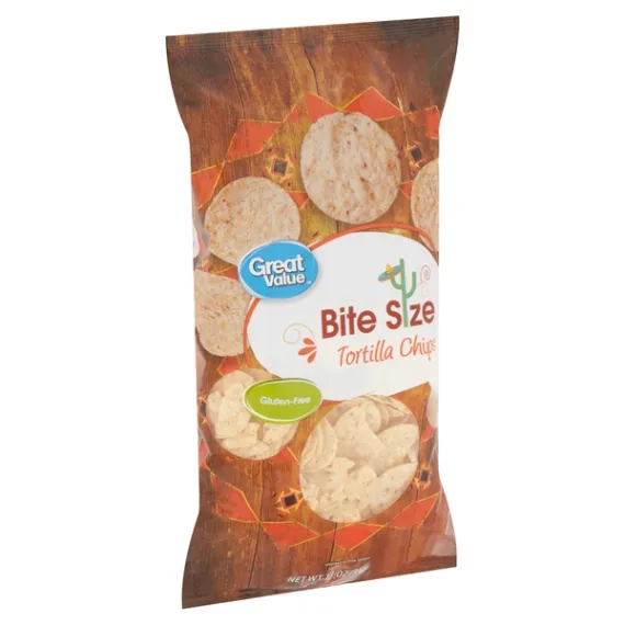 Details Ingredients GROUND WHITE CORN, VEGETABLE OIL (CONTAINS ONE OR MORE OF THE FOLLOWING: CORN, SUNFLOWER, SAFFLOWER,OR CANOLA OIL), SALT. Show more Product features Enjoy the delightful, crispy crunch of Great Value Bite Size Tortilla Chips. Our gluten-free tortilla chips are made with three simple ingredients: ground white corn, vegetable oils, and salt, making them the perfect wholesome snack to add to your pantry. Enjoy them straight from the bag, dip them into chunky salsa, 7-layer dip, or guacamole for a side dish on taco night. Pile them high with ground beef, onions, melted cheese, sour cream, and jalapenos for the ultimate loaded nachos! With only 140 calories and 2 grams of fiber per serving you can indulge in these tortilla chips guilt free. When you are craving a delicious and satisfying snack, make the smart choice and reach for a bag of Great Value Bite Size Tortilla Chips. Great Value products provide families with affordable, high quality grocery and household consumable options. With our wide range of product categories spanning grocery and household consumables, we offer you a variety of products for your family's needs. Our products are conveniently available online and in Walmart stores nationwide, allowing you to stock up and save money at the same time. Bite size tortilla chips 2g fiber per serving Gluten free 13 servings 13oz bag Special Features Bite size Net Quantity of Content 13 X 1 oz