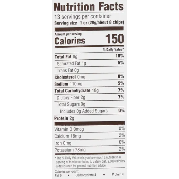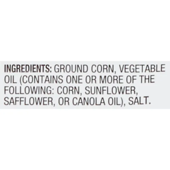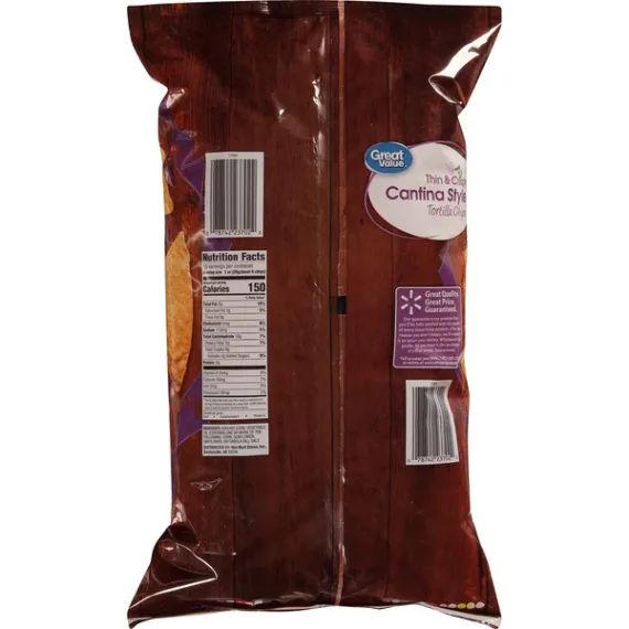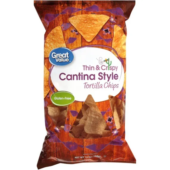 Details Ingredients Ground Corn, Vegetable Oil (Contains One or More of the Following: Corn, Sunflower, Safflower or Canola Oil), Salt. Product features Great Value Thin & Crispy Catina Style Tortilla Chips are the perfect chips to satisfy your hunger. They are thin and crispy chips with the classic tortilla chip flavor. The chips make a good pairing with salsa, guacamole or bean dip and will have you coming back for another scoop. The chips can even be added to tacos to give them a crunchy texture. These multipurpose chips seem to be a hit for all ages and at all events, so next time you are looking for a chip to pair with salsa or a dip go ahead and enjoy Great Value Thin & Crispy Catina Style Tortilla Chips.Great Value products provide families with affordable, high quality grocery and household consumable options. With our wide range of product categories spanning grocery and household consumables, we offer you a variety of products for your family’s needs. Our products are conveniently available online and in Walmart stores nationwide, allowing you to stock up and save money at the same time. Great Value Thin & Crispy Catina Style Tortilla Chips, 13 oz:Tortilla chipsCrispyPerfect for snackingPair with salsa, guacamole or bean dipNet weight 13 oz