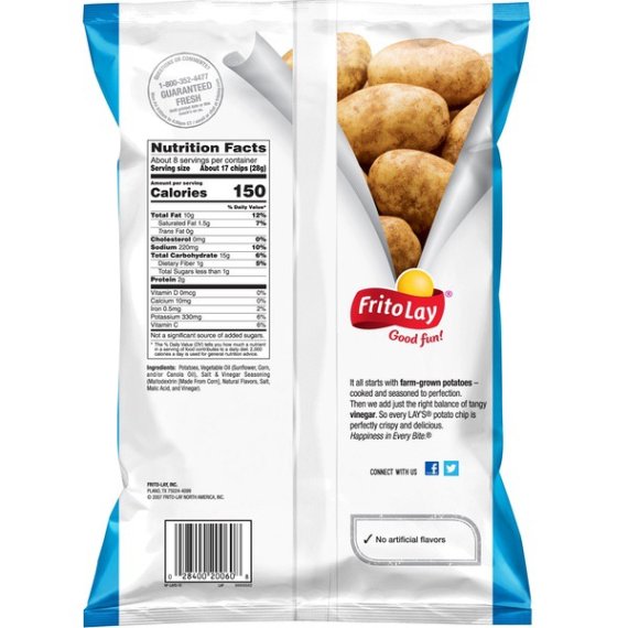 Details Ingredients Potatoes, Vegetable Oil (Sunflower, Corn and/or Canola Oil), Salt & Vinegar Seasoning (Maltodextrin (Made from Corn), Natural Flavors, Salt, Malic Acid, and Vinegar). Show more Product features It all starts with farm-grown potatoes, cooked and seasoned to perfection. Then we add just the right balance of tangy vinegar. So every LAY'S potato chip is perfectly crispy and delicious. Happiness in Every Bite. Delicious tangy salt & vinegar flavor Large bag is perfect for sharing A tasty snack for the whole family to enjoy