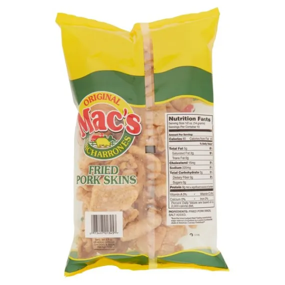 Details Ingredients Fried Pork Rinds, Salt Added Product features Mac's Original Fried Pork Skins, 5 Oz. Product Features0g total carbohydrates per servingAmerican Culinary Chefs Best2005 Best Taste Award - www.chefsbest.org*Best Taste Award Winner*From the brand judged Best Tasting overall among major national competitors by a panel of professional chefs of American Culinary ChefsBest.General Offices,Chicago, IL, 60609.www.evansfood.com Special Features NOT STATED Net Quantity of Content 10 X 0.5 oz