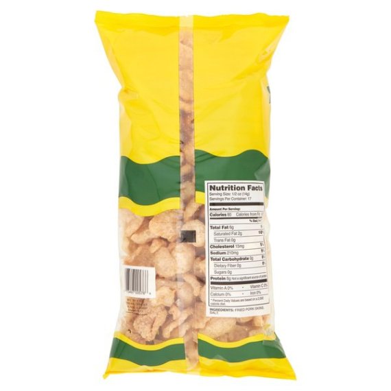 Details Ingredients FRIED PORK SKINS, SALT. Product features Mac's Original Pork Skins Product Features0g carbs per serving80 calories0g transfat per servingGluten freewww.evansfood.com Net Quantity of Content 17 X 0.5 oz