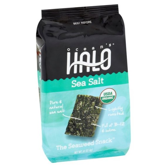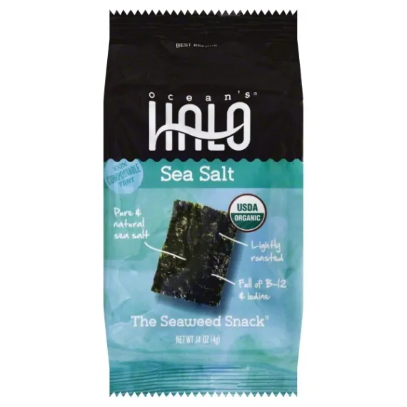 Details Ingredients ORGANIC SEAWEED, ORGANIC SUNFLOWER OIL, SEA SALT. Product features Ocean’s Halo Organic Sea Salt Seaweed Snack, .14 oz. unit Seaweed Snack Organic Vegan Gluten-free Non-GMO Sustainably farmed kelp Learn more at oceanshalo.com Seaweed Snack, Sea Salt 100% compostable tray. Pure & natural sea salt. USDA organic. Lightly roasted. Full of B-12 & iodine. Swim against the tide. Eat seaweed. What's better than a regular old seaweed sheet? Our yummy organic seaweed snacks are made with sustainably harvested seaweed, packed with good-for-you vitamins, like B12, and rich in minerals, like iodine, that are super important to your health. Like them? Tell us: Facebook: fb.com/oceanshalo. Twitter: (at)oceanshalo. Please recycle this bag. Certified organic by FIQ. Certified vegan. vegan.org. No gluten ingredients. We donate 2% or our profits to the Monterey Bay Aquarium's Children's Education Fund to inspire ocean conservation. www.oceanshalo.com. Product of Korea. Net Quantity of Content 1 X 4 g