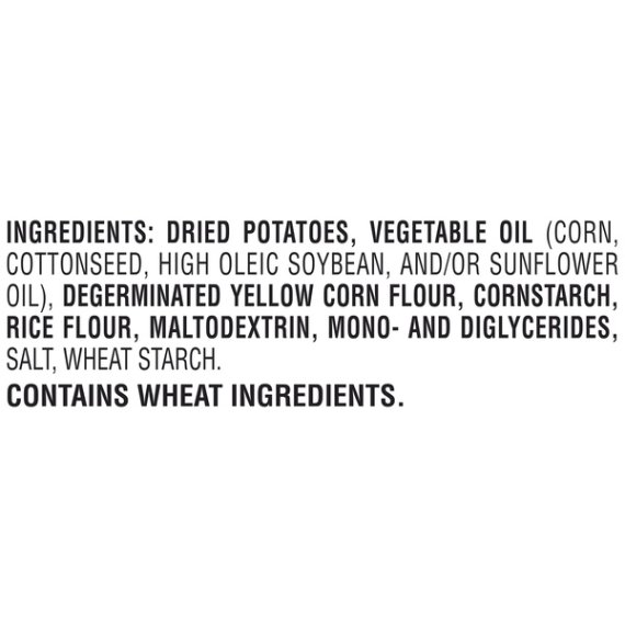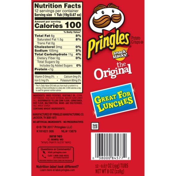 Details Ingredients Dried Potatoes, Vegetable Oil (Contains one or more of the following: Corn Oil, Cottonseed Oil, Soybean Oil, and/or Sunflower Oil), Corn Starch, Degerminated Yellow Corn Flour, Rice Flour, Maltodextrin, Mono-Diglycerides, Salt, Wheat Dextrose Show more Product features Provide your family with a crispy, crunchy, light snack with Pringles Potato Crisps. They are made with potatoes, vegetable oil, yellow corn and rice flours, cornstarch and salt and feature the iconic Pringles shape that people have enjoyed for decades. These original-flavor, crunchy chips come in individually sized containers that are ideal for packing in lunches or taking with you on the go. Each tub contains enough chips to make an ideal accompaniment to soup, a raw veggie plate or a sandwich. Pringles crisps, 12-count, are made with no artificial ingredients, preservatives, sugars or trans-fat. Pringles Original Potato Crisps:Made with potatoes, vegetable oil, yellow corn and rice flours, cornstarch and saltSnack stacksNo artificial ingredientsNo preservativesContains no sugars or trans-fat12 individual packages of Pringles crisps per packPringles Potato Crisps Chips, classic flavor with satisfying crunchIdeal for lunches, parties, game day and snacking on the goPringles crisps, 12-count, provide Easy snacking in the car and when on the run
