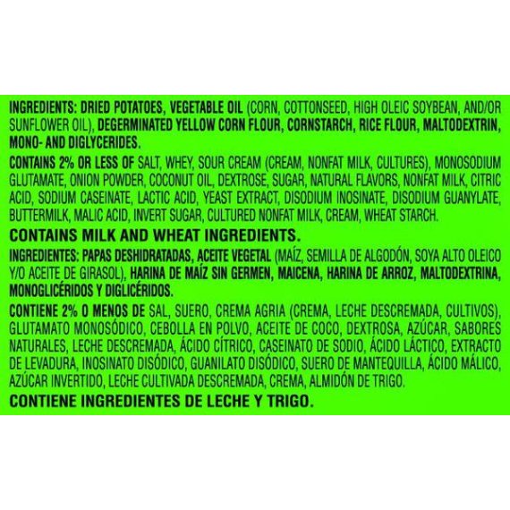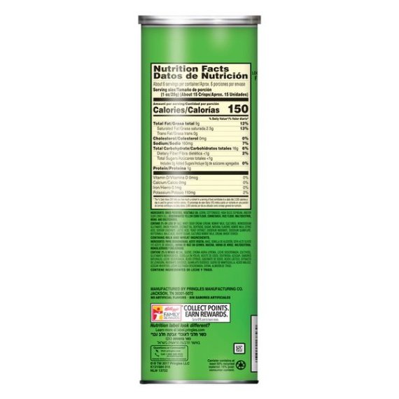 Details Ingredients DRIED POTATOES, VEGETABLE OIL (CORN, COTTONSEED, HIGH OLEIC SOYBEAN, AND/OR SUNFLOWER OIL), DEGERMINATED YELLOW CORN FLOUR, CORNSTARCH, RICE FLOUR, MALTODEXTRIN, MONO- AND DIGLYCERIDES.CONTAINS 2% OR LESS OF SALT, WHEY, SOUR CREAM (CREAM, NONFAT MILK, CULTURES), MONOSODIUM GLUTAMATE, ONION POWDER, COCONUT OIL, DEXTROSE, SUGAR, NATURAL FLAVORS, NONFAT MILK, CITRIC ACID, SODIUM CASEINATE, LACTIC ACID, YEAST EXTRACT, DISODIUM INOSINATE, DISODIUM GUANYLATE, BUTTERMILK, MALIC ACID, INVERT SUGAR, CULTURED NONFAT MILK, CREAM, WHEAT STARCH. Show more Product features Your favorite flavor combo of yummy sour cream and zesty onion is now in your favorite potato crisp. Deliciously seasoned Sour Cream and Onion Flavored Pringles Potato Crisps are flavored from edge to edge for a craveable taste and perfect crunch. With their delicious taste and original, stackable shape, Pringles Potato Crisps always inspire good times with friends—and the convenient, portable can gives you the freedom to snack when and where you want. Grab a can for the office, pack a snack for school, bring them in the car, or share a stack with friends—however you eat them, you'll love the fun shape and delicious taste of Sour Cream and Onion Flavored Pringles Potato Crisps. • Satisfy your snack craving with the irresistible taste of savory sour cream and onion flavored potato crisps; uniquely shaped and seasoned from edge to edge for a perfectly flavored bite every time• Make snack time more fun with the original, stackable potato crisp; pop open a can and experience the bold flavor and satisfying crunch of Sour Cream and Onion Flavored Pringles Potato Crisps• Always tasty, never greasy; a delicious and crispy way to put the wow in your snacking routine; a travel-ready food made to enjoy at home or on-the-go; no artificial flavors• Grab a can at game time, pack a snack for school, enjoy a stack at the office and stow them in lunchboxes; the savory, stackable snack options are endless• Convenient, ready to eat potato crisps, stacked in a 5.5-ounce can; Kosher OU-D; packaged for freshness and great taste Net Quantity of Content 6 X 28 g