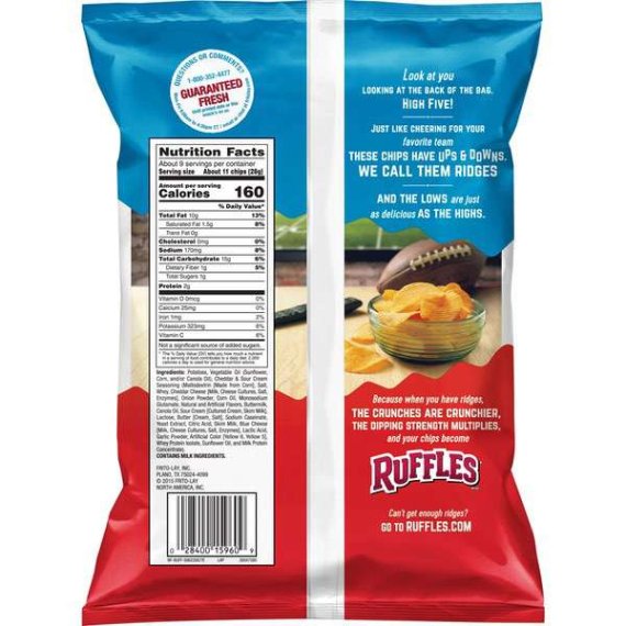 Details Ingredients Potatoes, Vegetable Oil (Sunflower, Corn, And/Or Canola Oil), Cheddar & Sour Cream Seasoning (Salt, Whey Protein Concentrate, Cheddar Cheese [Milk, Cheese Cultures, Salt, Enzymes], Maltodextrin [Made from Corn], Whey, Onion Powder, Corn Oil, Natural Flavor, Canola Oil, Buttermilk, Sour Cream [Cultured Cream, Skim Milk], Lactose, Butter [Cream, Salt], Yeast Extract, Citric Acid, Lactic Acid, Blue Cheese [Milk, Cheese Cultures, Salt, Enzymes], Skim Milk, Paprika Extracts, Garlic Powder, Sunflower Oil, Milk Protein Concentrate, And Annatto Extracts). Contains Milk Ingredients. Show more Product features Ruffles! Cheddar & Sour Cream Flavored Potato Chips. Ruffles have Rrridges! Ruffles Potato Chips Cheddar & Sour Cream.Partially produced with genetic engineering.Look at you looking at the back of the bag.High five!Just like cheering for your favorite team.These chips have ups & down.We call them ridges and the lows are just as delicious as the highs.Because when you have ridges, the crunches are crunchies, the dipping strength multiplies, and your chips become Ruffles® brand.Questions or comments?1-800-352-4477 Mon-Fri 9:00am to 4:30pm CT/ email or chat at fritolay.com.Can't get enough ridges?Go to ruffles.com.©2015 Frito-Lay North America, Inc.