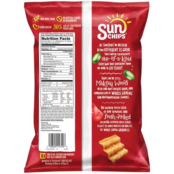 Details Ingredients Whole Corn, Sunflower and/or Canola Oil, Whole Wheat, Brown Rice Flour, Whole Oat Flour, Sugar, Tomato Powder, Salt, Natural Flavors, Maltodextrin (Made from Corn), Cheddar Cheese (Milk, Cheese Cultures, Salt, Enzymes), Dextrose, Buttermilk, Onion Powder, Whey, Yeast Extract, Romano Cheese (Part-Skim Cow's Milk, Cheese Cultures, Salt, Enzymes), Whey Protein Concentrate, Corn Oil, Spices (Including Jalape o Pepper), Citric Acid, Paprika Extracts, and Lactic Acid. Show more Product features You want zesty? You got it. In fact, how about the garden fresh taste of ripe tomatoes and fresh-picked jalapeno peppers, delivered right to your mouth on waves of whole grain goodness? Even better. SunChipsaren't just any snack. They are the square, wavy, tasty, 100% whole grain-y snack that take afternoon snacking from ho hum to oh yeah. They are a snack that you feel good about sharing, but secretly wish you had all to yourself. SunChipsare an entirely different kind of snack and when you look closely, you can see it's what's inside those unique waves that make SunChipsone-of-a-kind. They are 100% whole grain with flavors inspired by fresh, real ingredients. That means they don't need artificial flavors or preservatives to make them taste amazing! Know what else? SunChipscontain 30% less fat than regular potato chips, creating a highly favorable wholesome-to-awesome ratio!